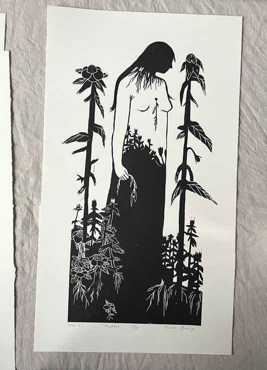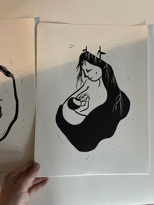 Liv - grønn/svart - Originalt linosnitt - 10% av inntekt per trykk går til Ammehjelpen