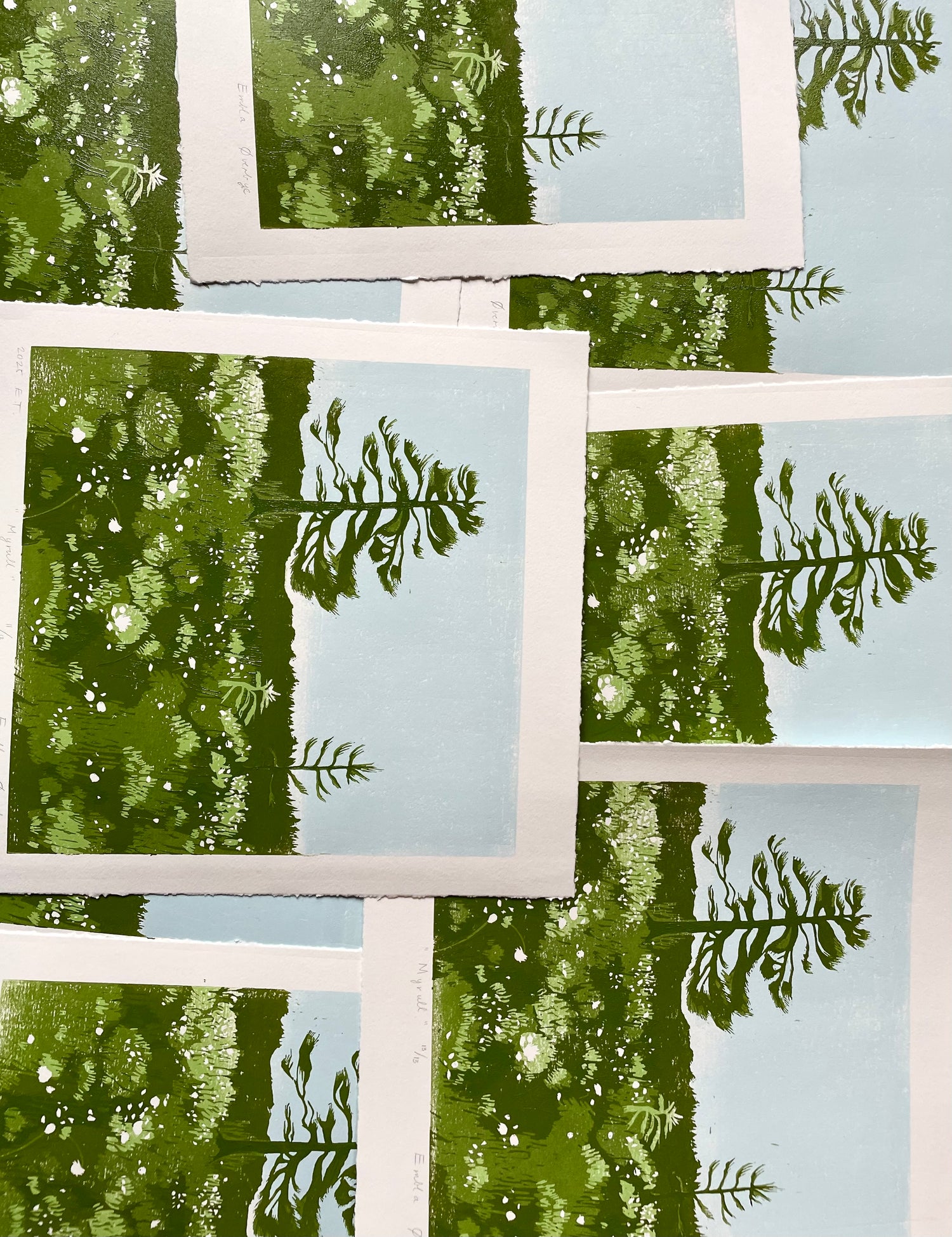 Vinterskog - Originalt reduksjonstrykk med 6 lag (linosnitt)
