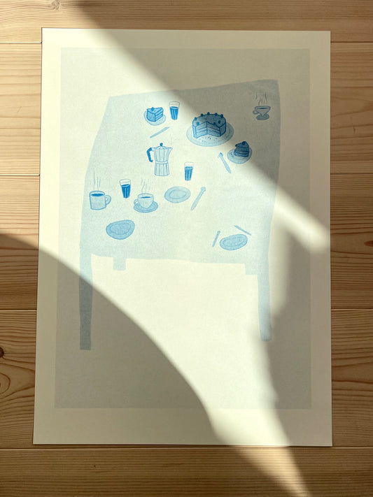 Tegnet/trykket av meg, trykket som riso av Blekkspruten Risotrykkeri i Oslo.