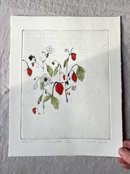 (Forhåndsbestilling) Markjordbær - Originalt håndkolorert koldnålstrykk