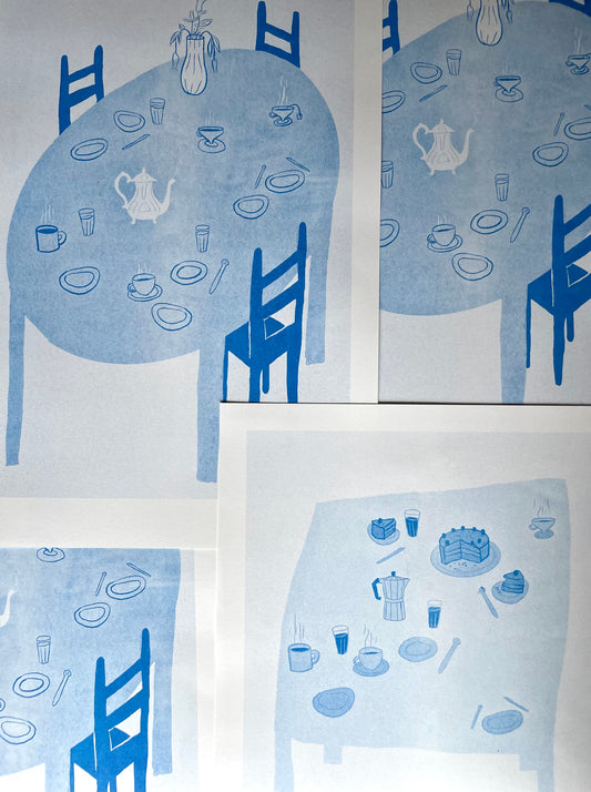 Tegnet/trykket av meg, trykket som riso av Blekkspruten Risotrykkeri i Oslo.