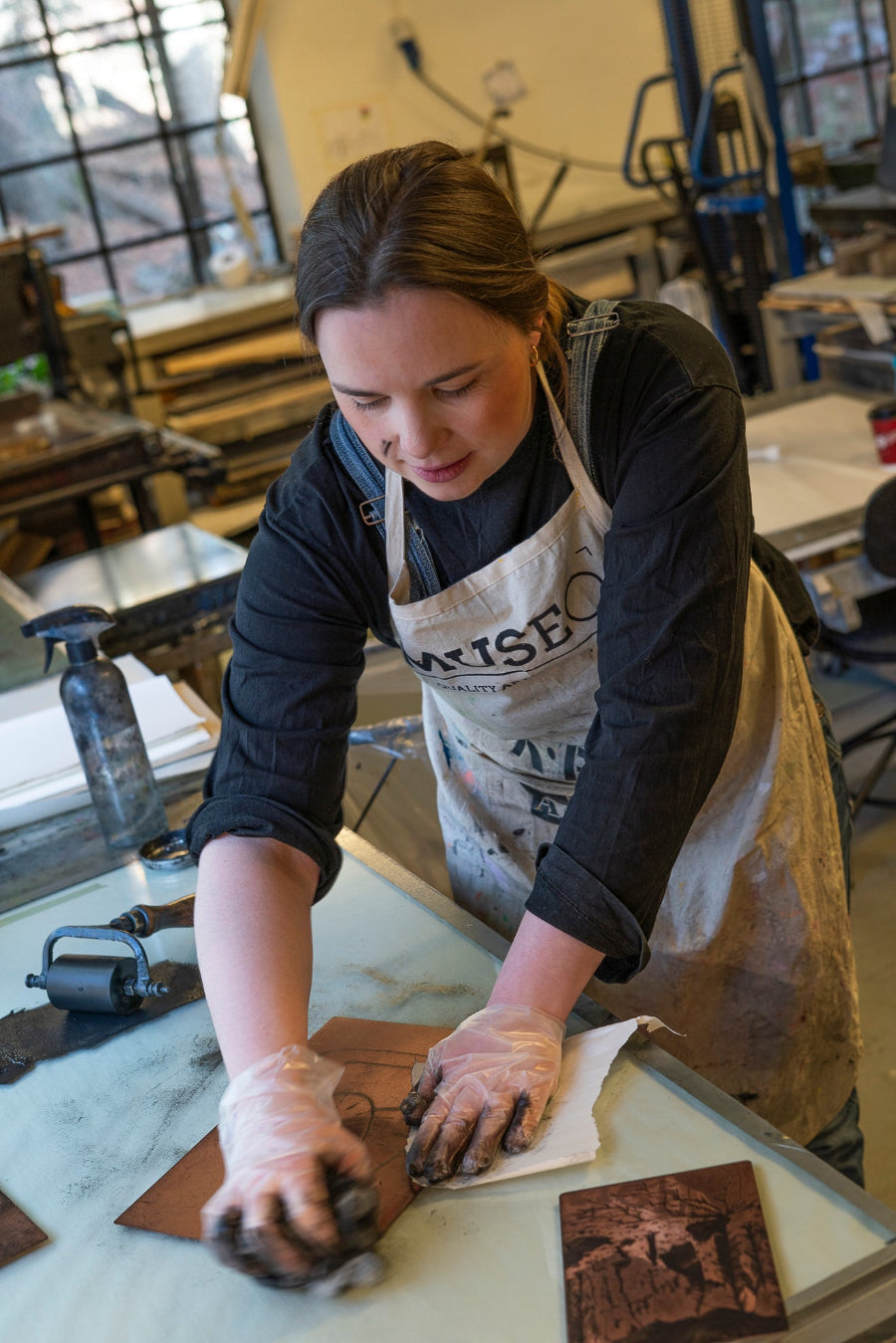 Trykket for hånd med dyptrykkspresse på Norske Grafikeres Verksted i Oslo.