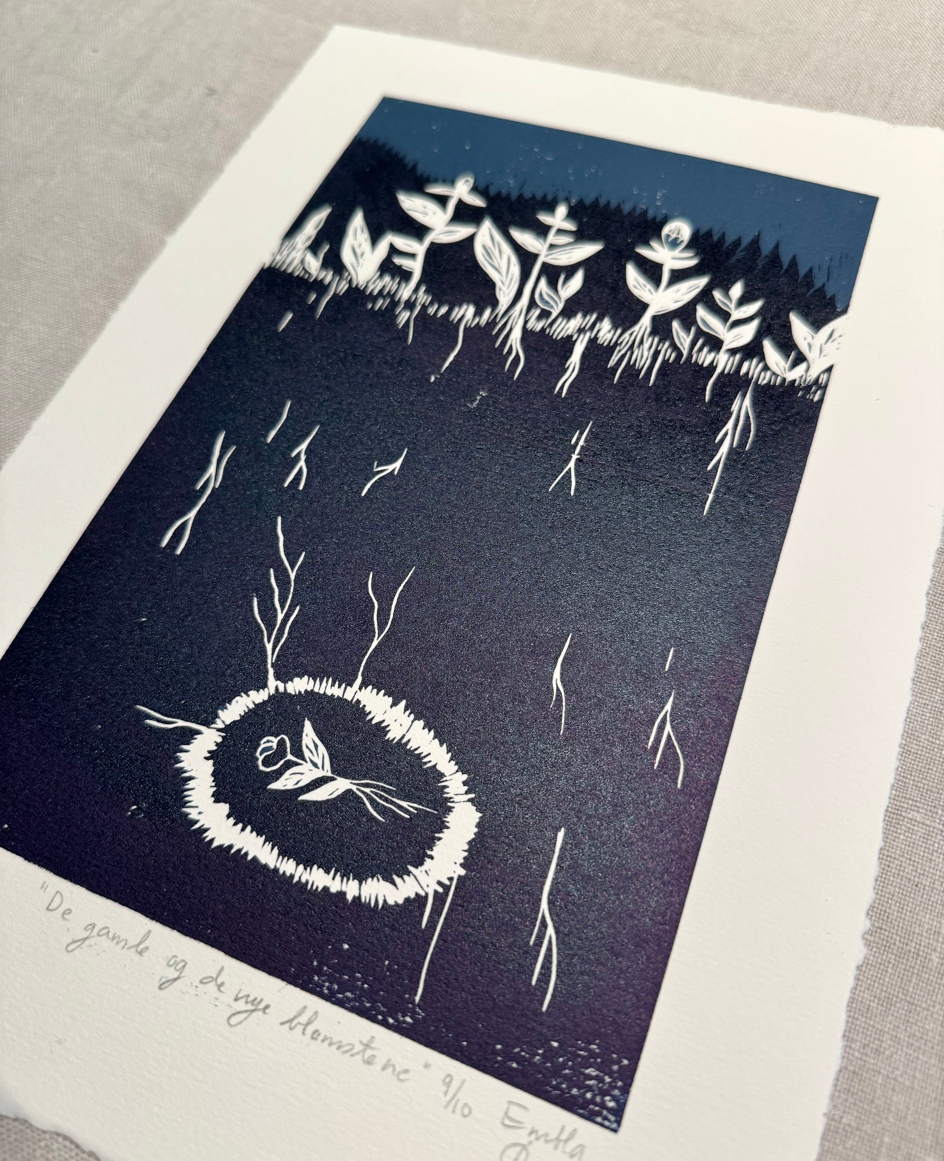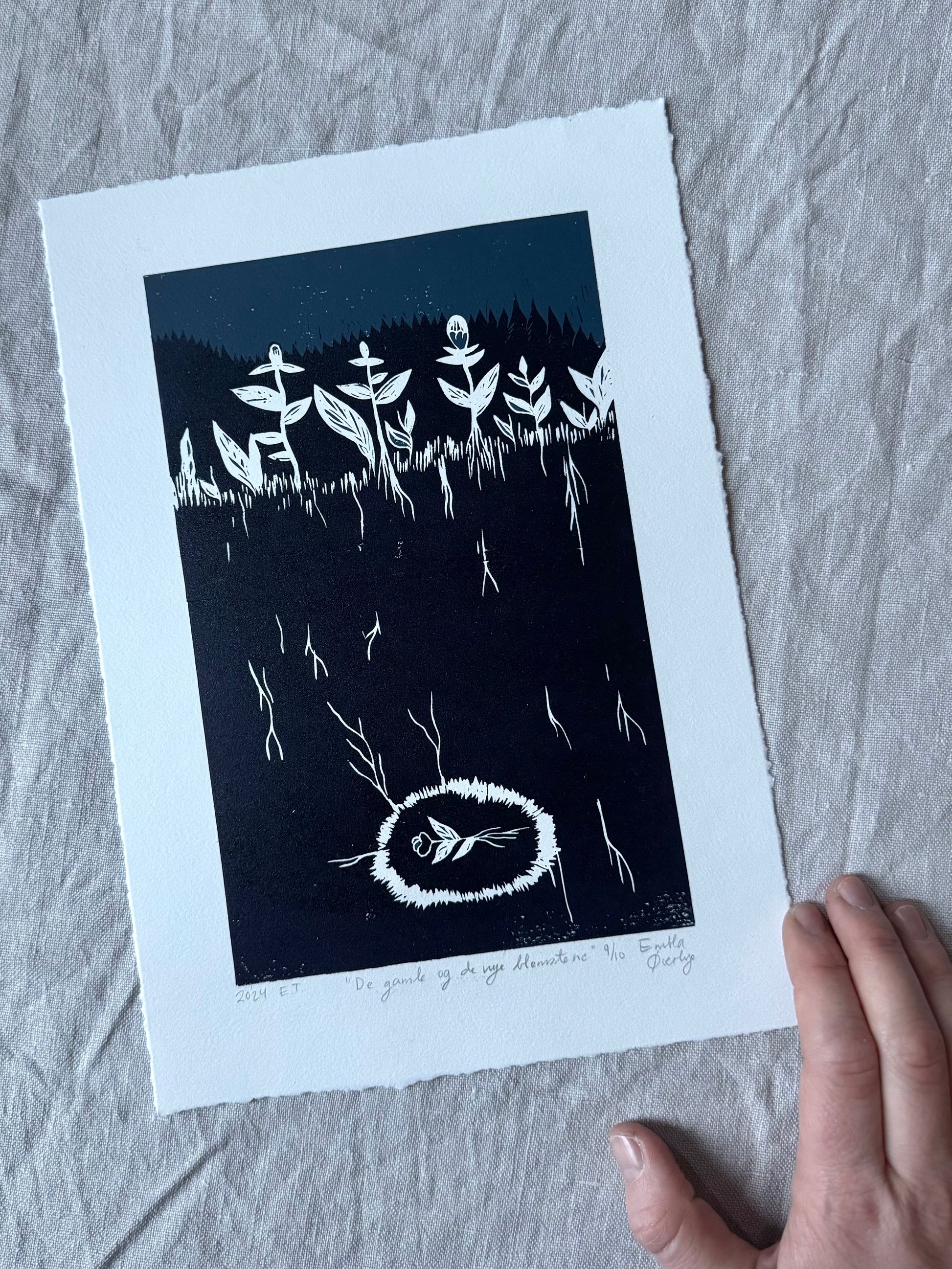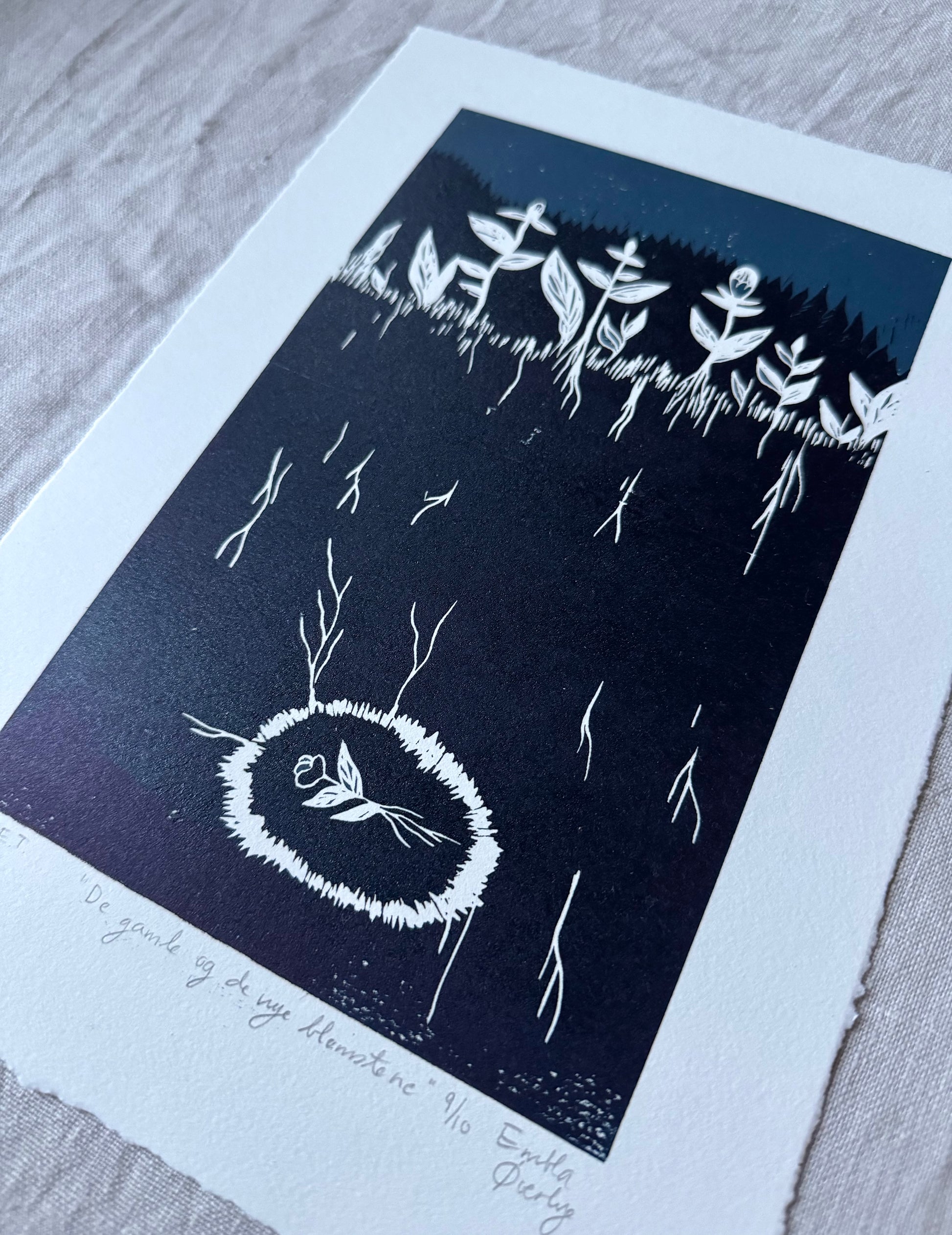«De gamle og de nye blomstene» er et originalt håndlaget linosnitt med 2 lag, 2 farger, laget ved bruk av reduksjonstrykkmetoden. Det er kun 10 trykk i denne utgaven, etter utsolgt vil den aldri trykkes på nytt!