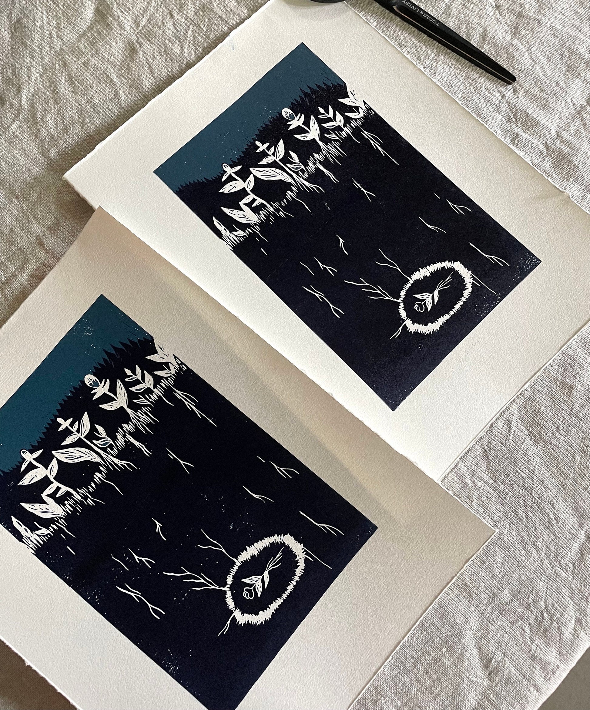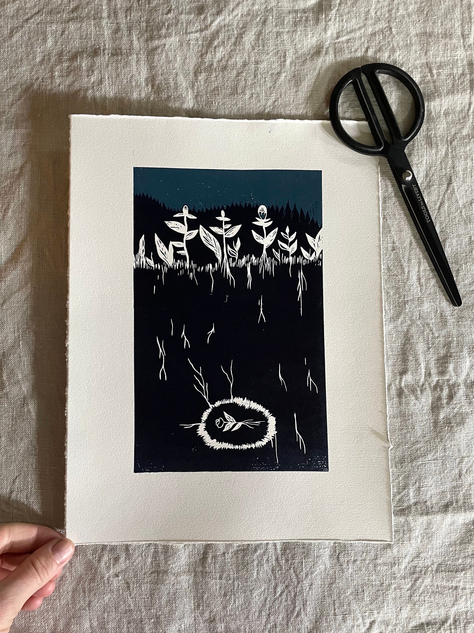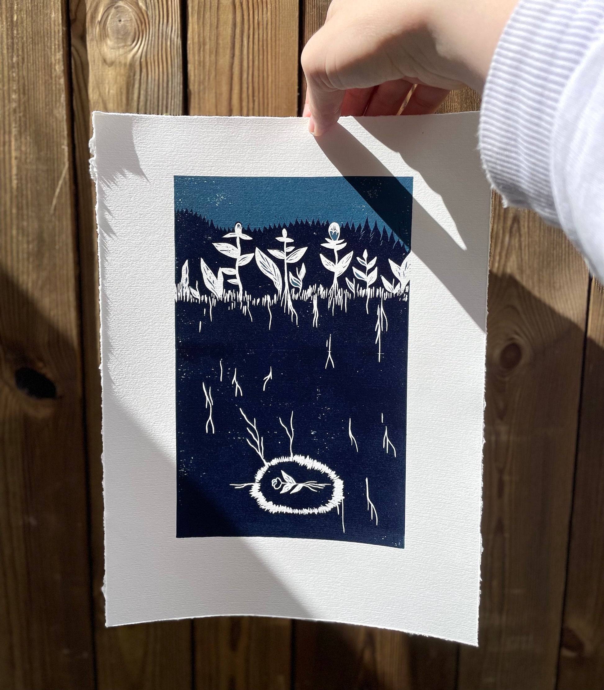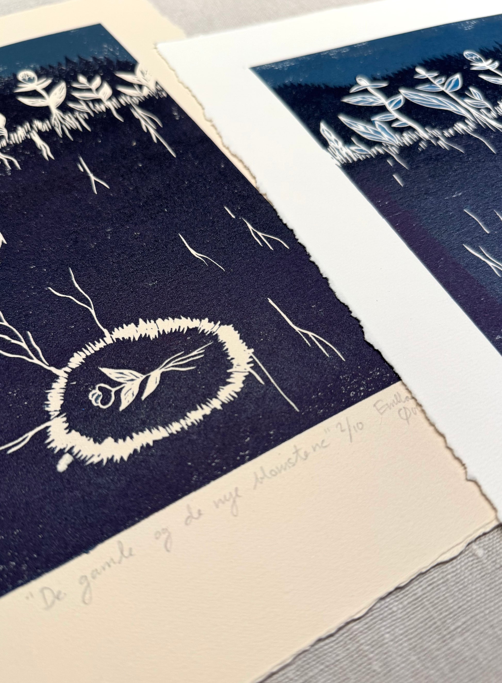 «De gamle og de nye blomstene» er et originalt håndlaget linosnitt med 2 lag, 2 farger, laget ved bruk av reduksjonstrykkmetoden. Det er kun 10 trykk i denne utgaven, etter utsolgt vil den aldri trykkes på nytt!