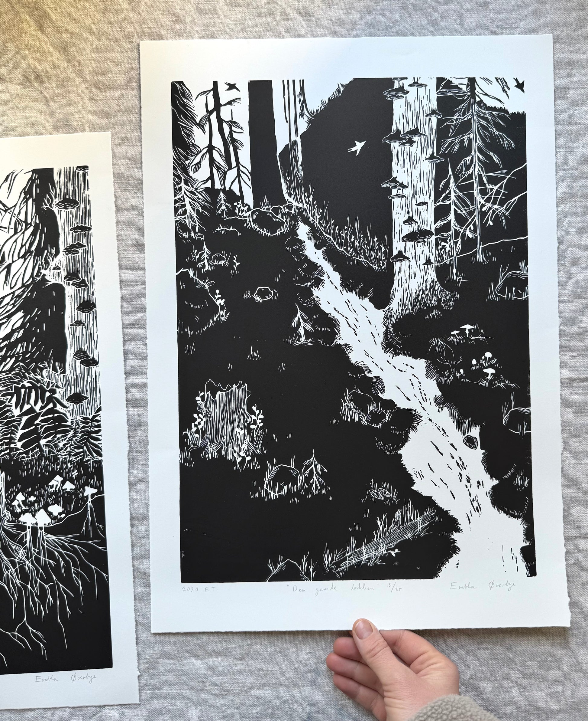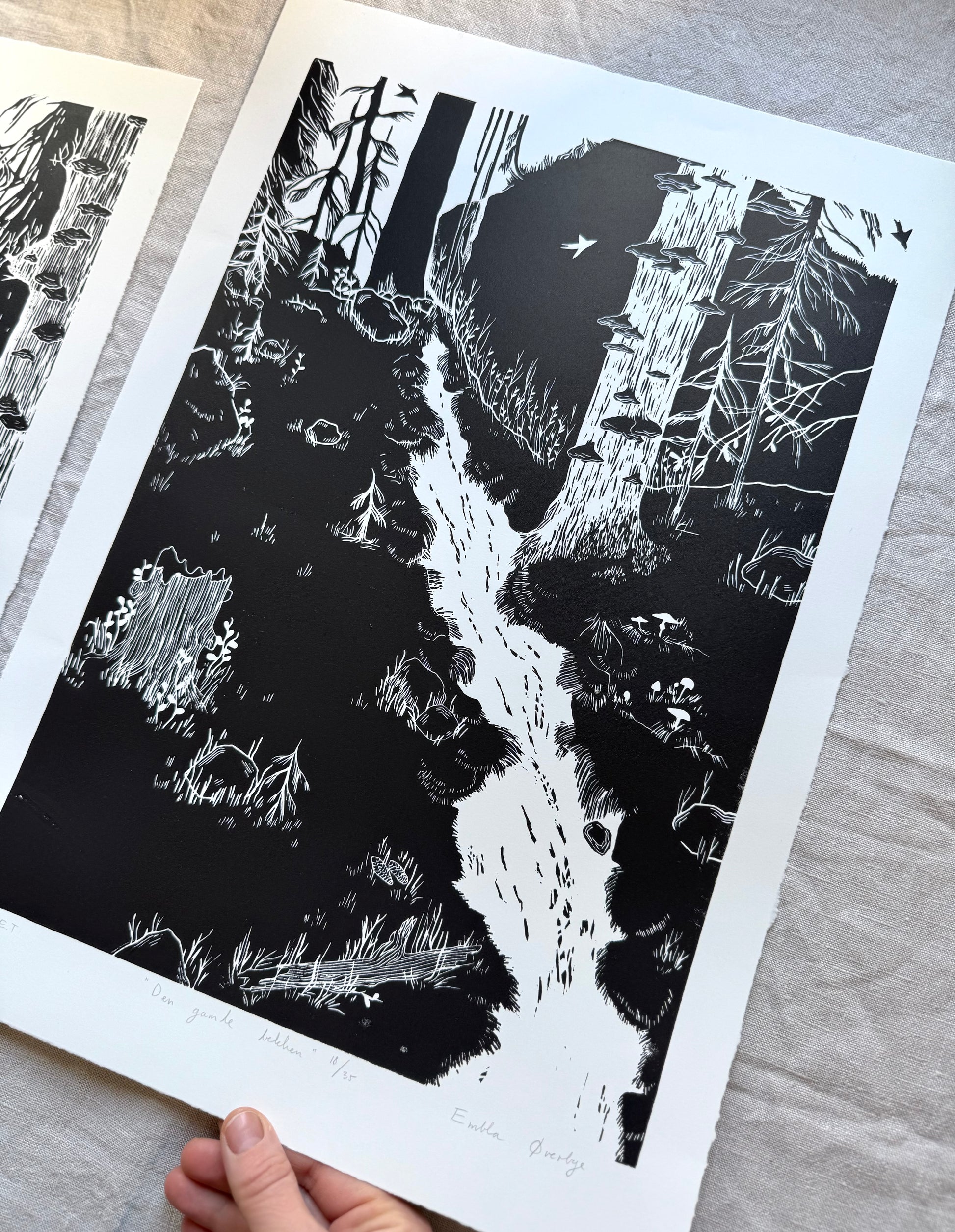«Den gamle bekken» er et originalt linosnitt trykket for hånd.