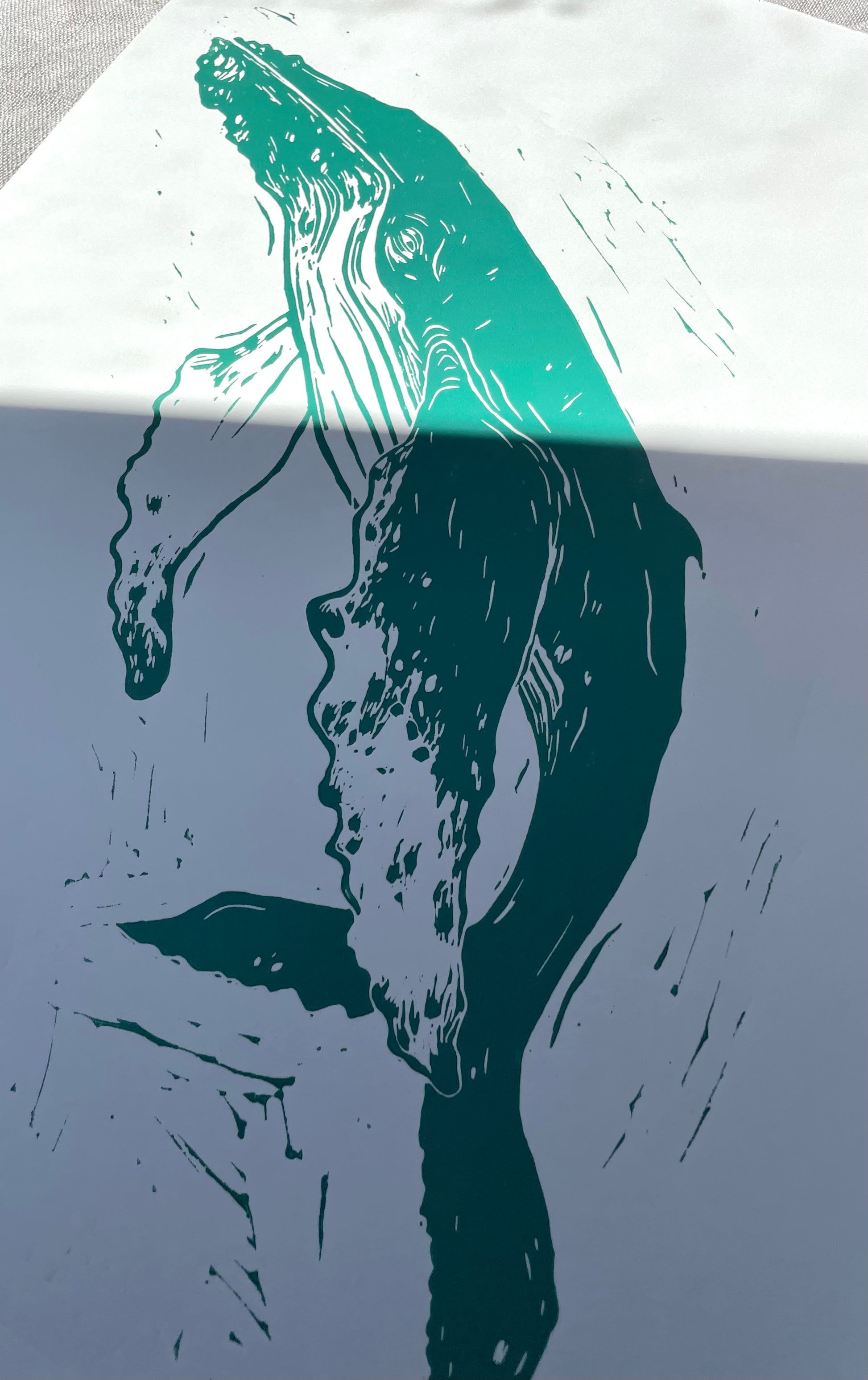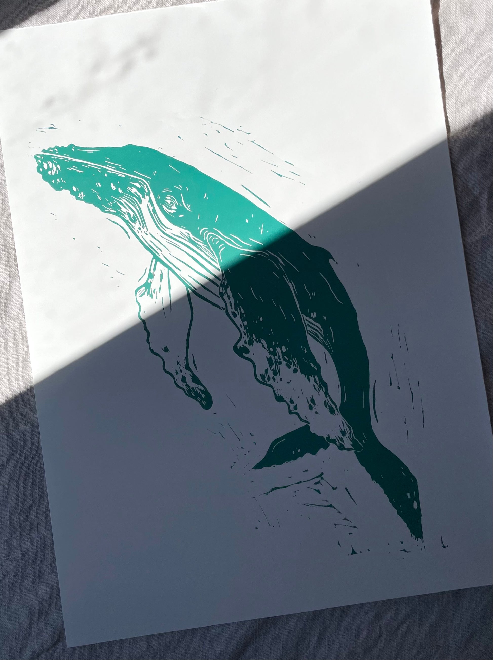 "Knølhval" er et originalt linosnitt trykket på Hereford grafikkpapir 145 gsm. 🌊🐋 Gammel og klok, med hud preget av havet🌊
