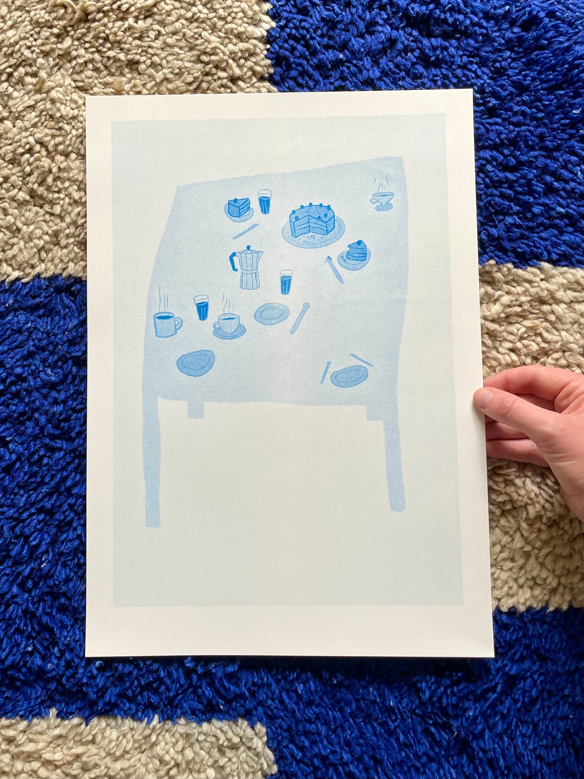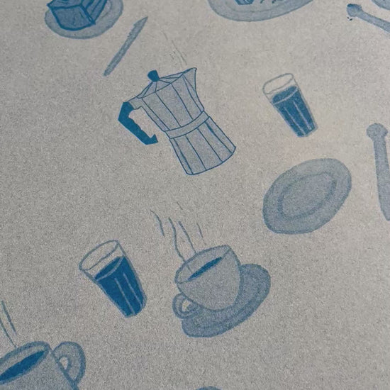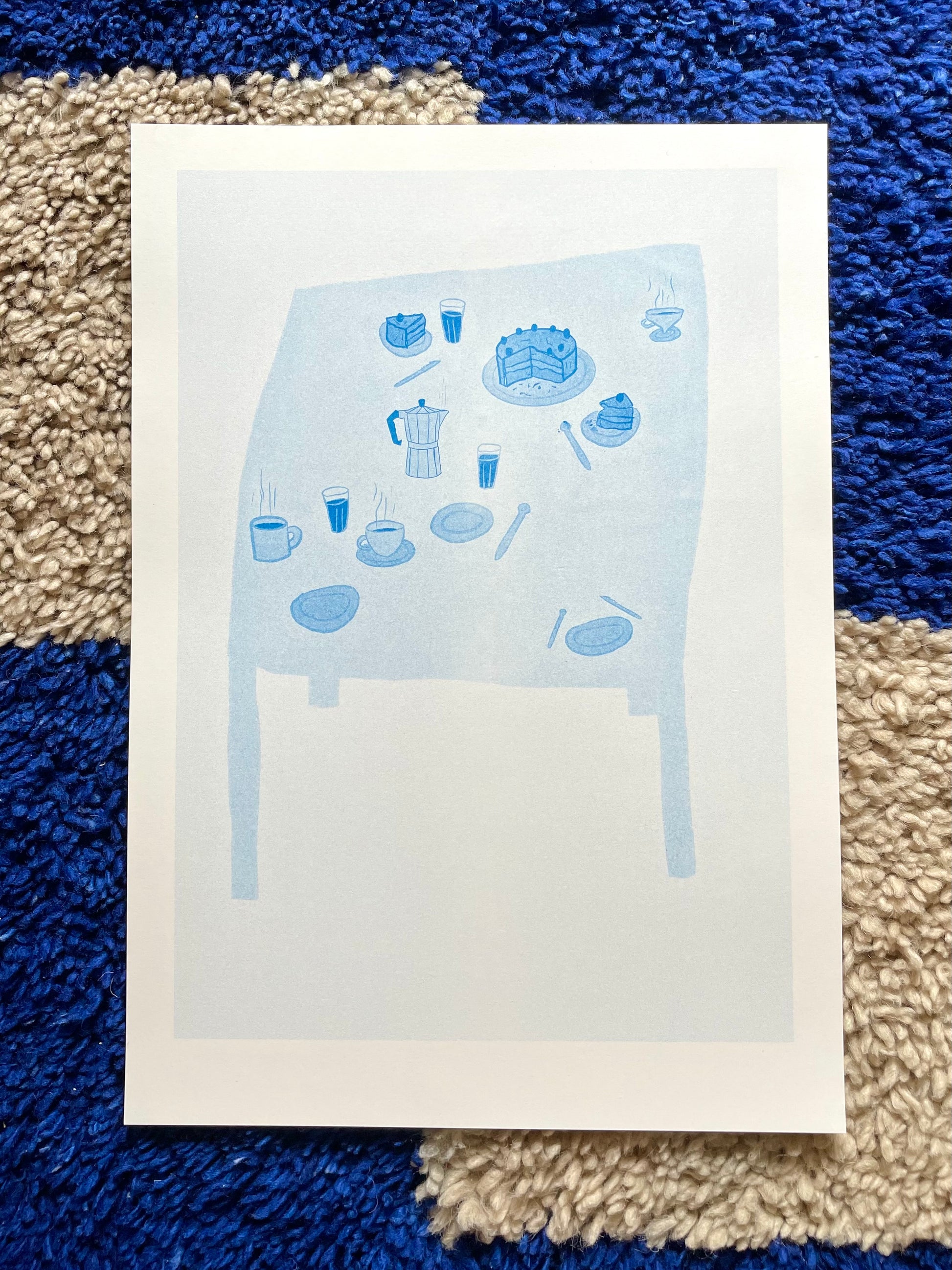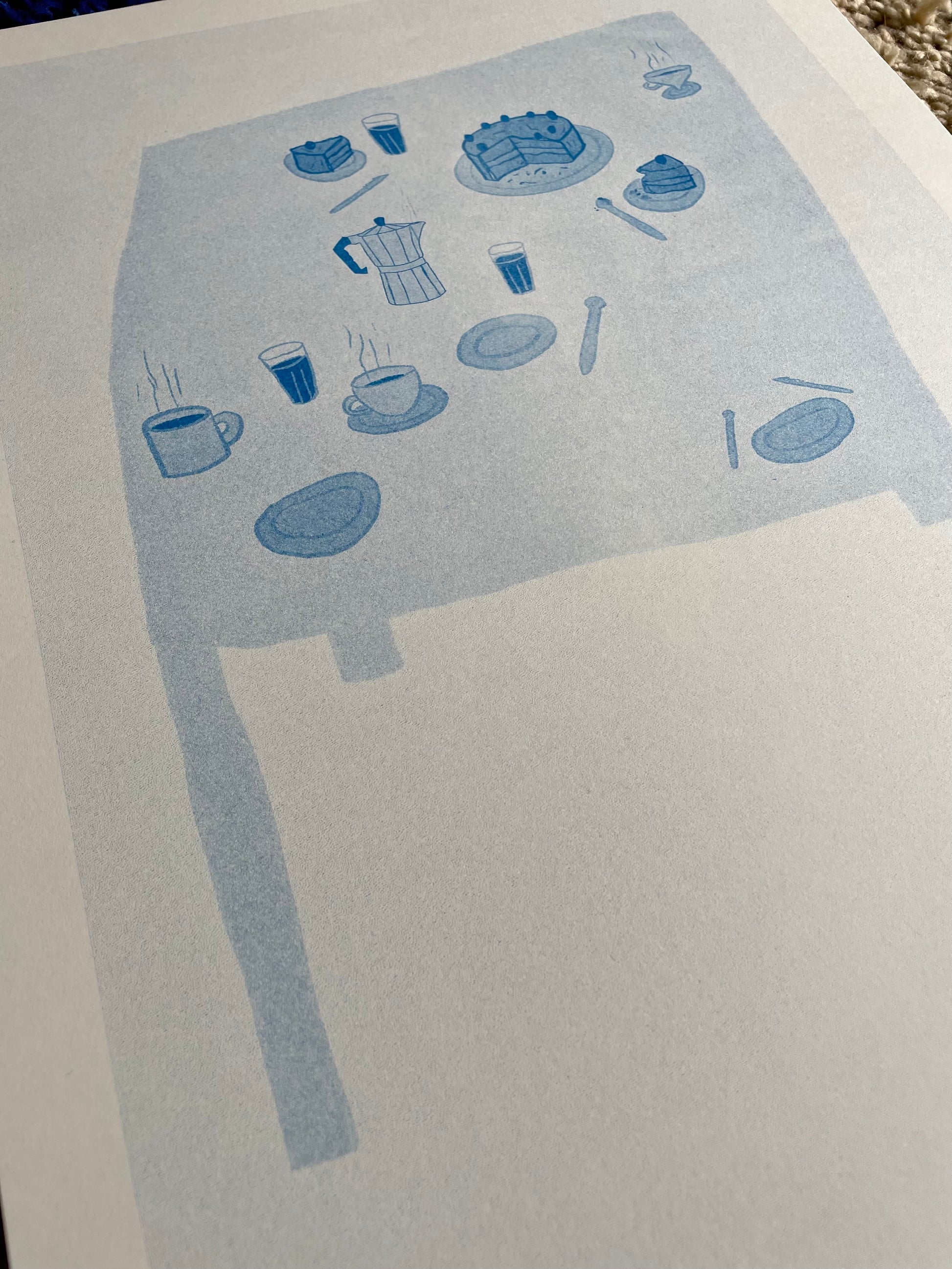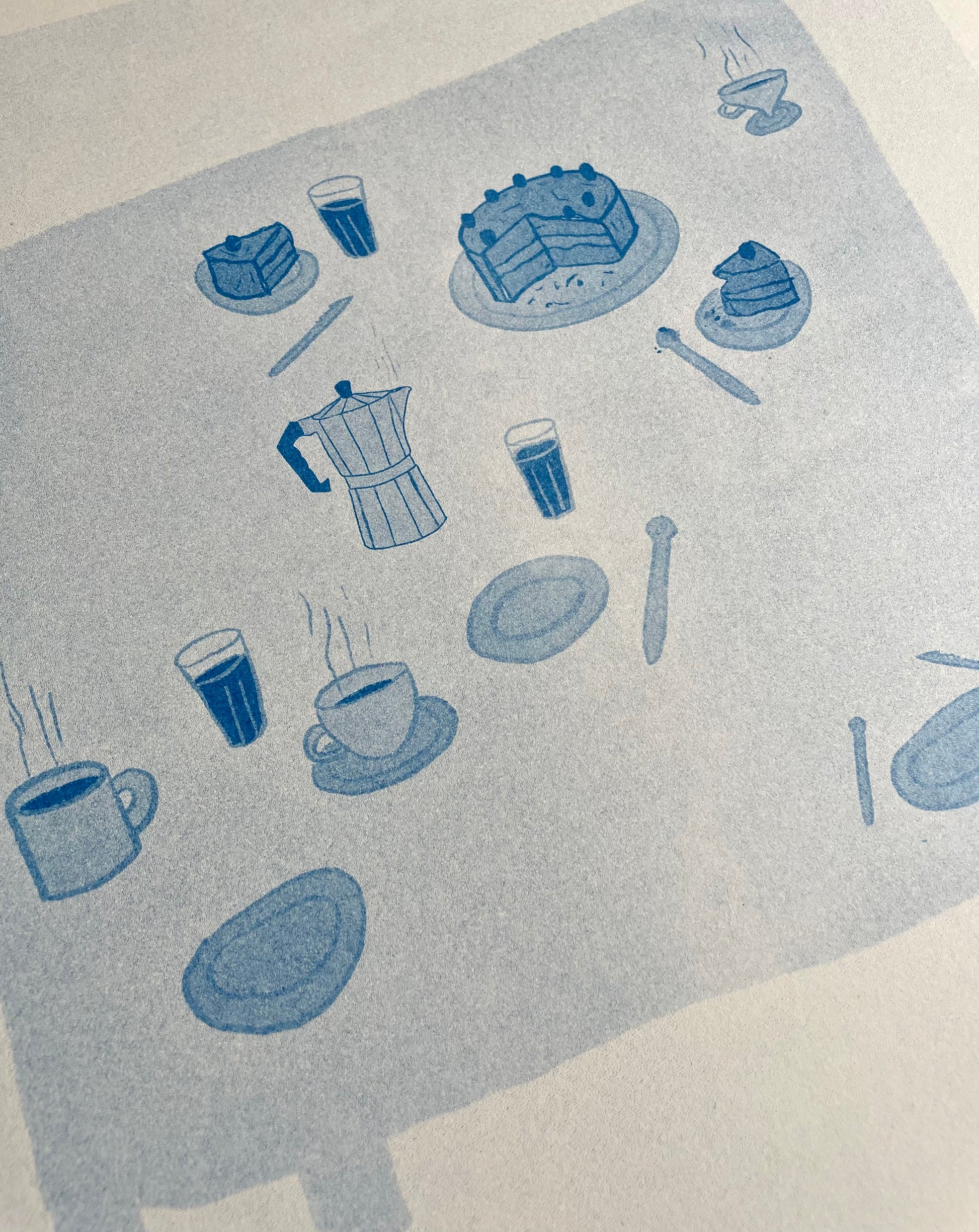 «Kaffe og kake» er et risotrykk trykket i blått. Trykket på 200g varmhvitt papir.