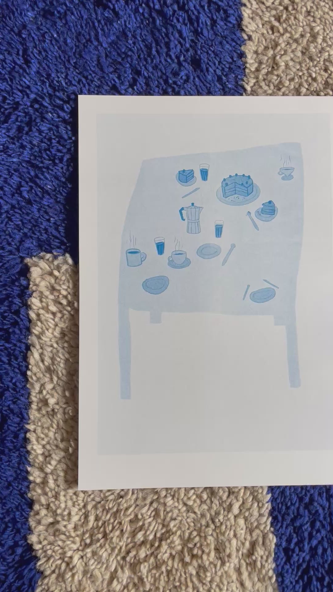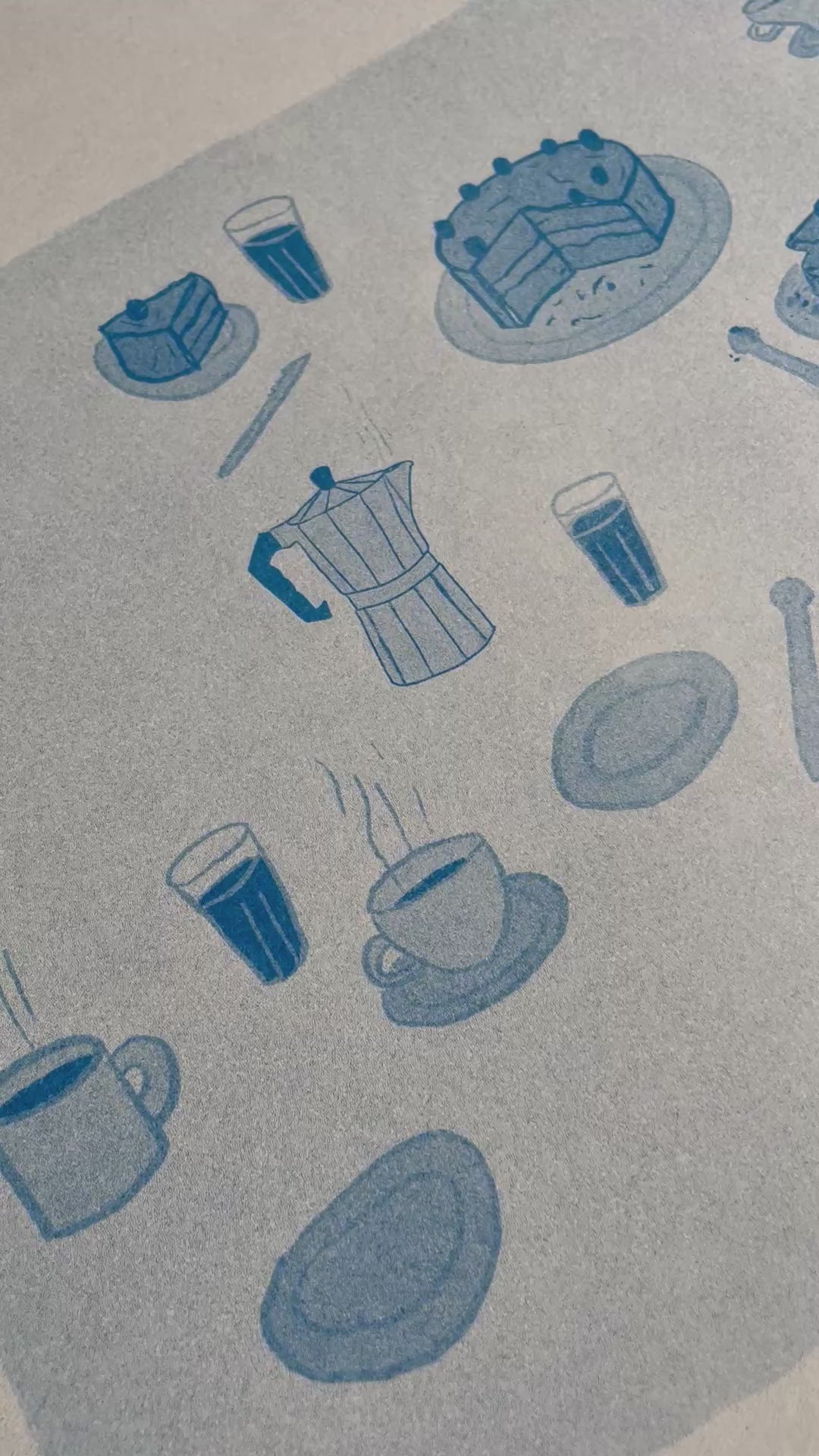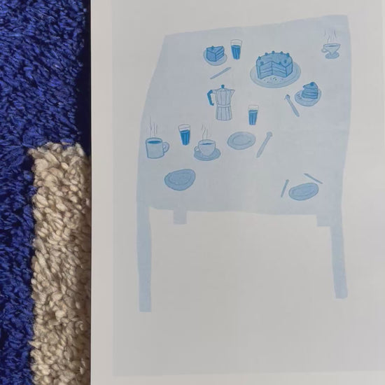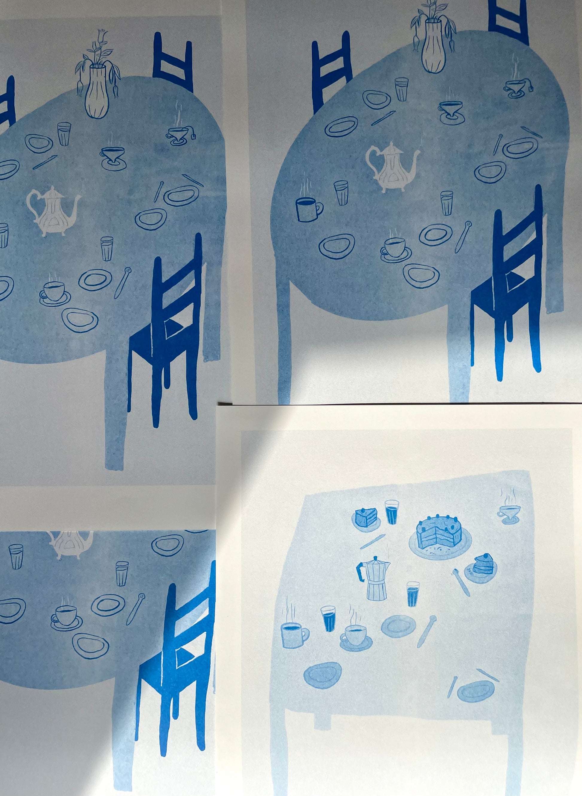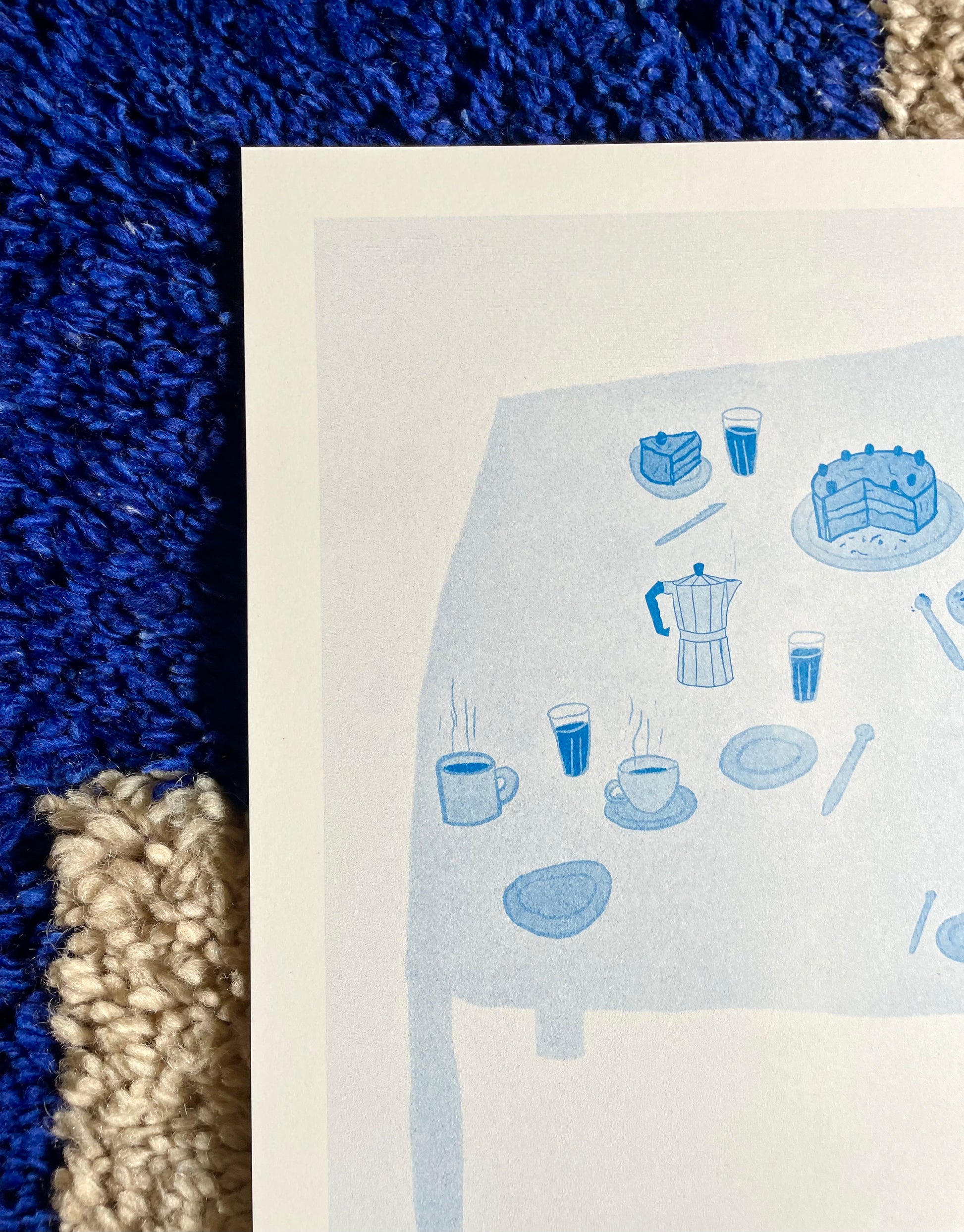 «Kaffe og kake» er et risotrykk trykket i blått. Trykket på 200g varmhvitt papir.