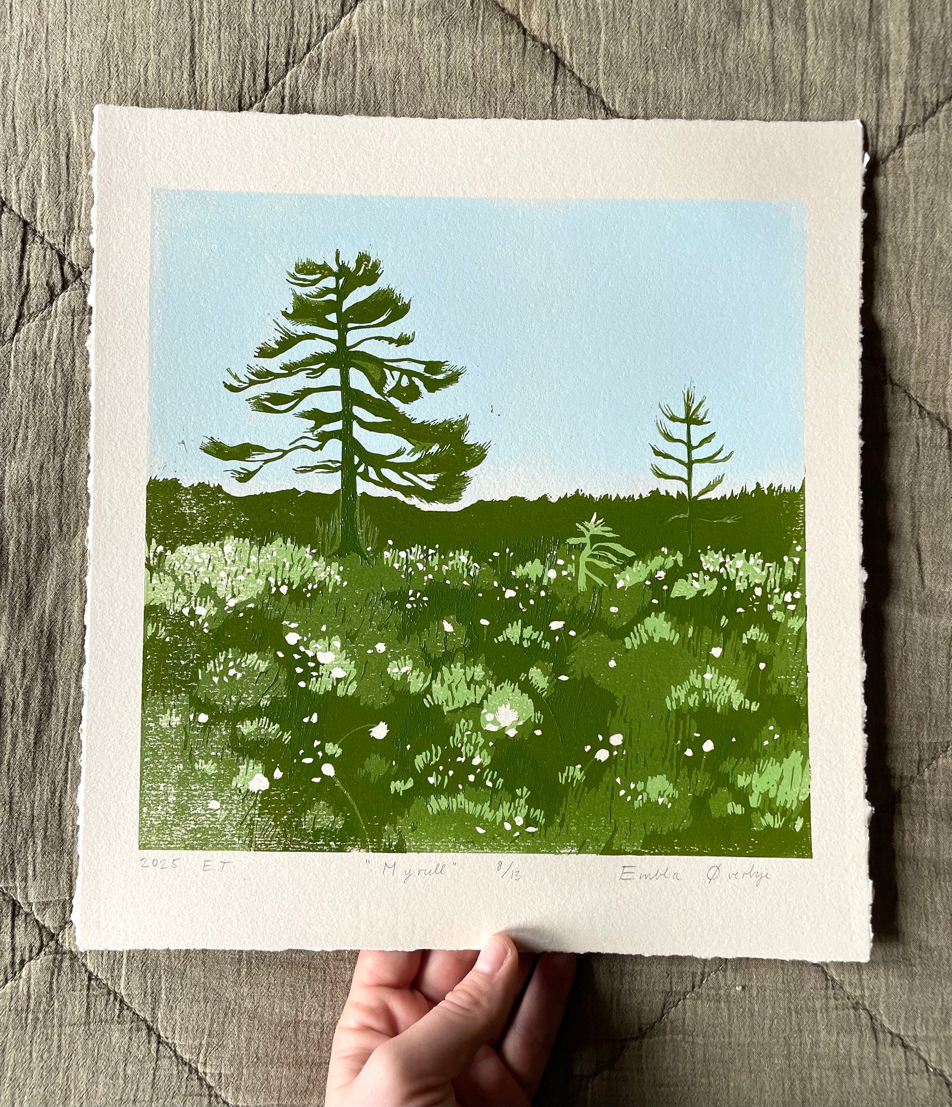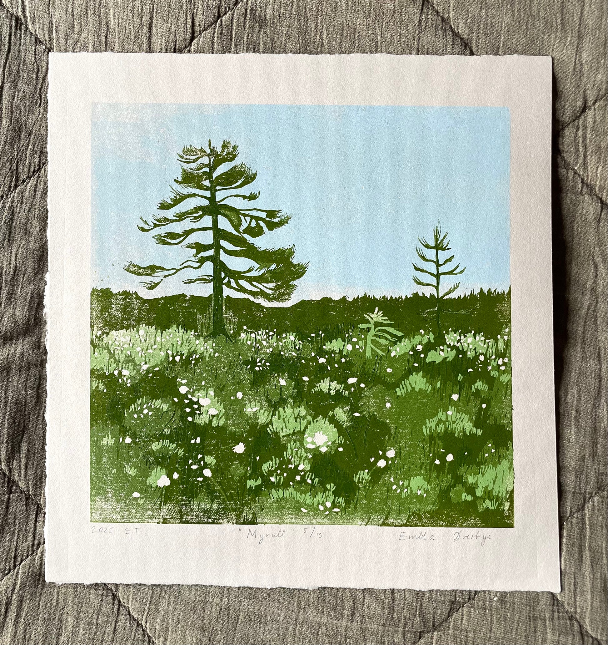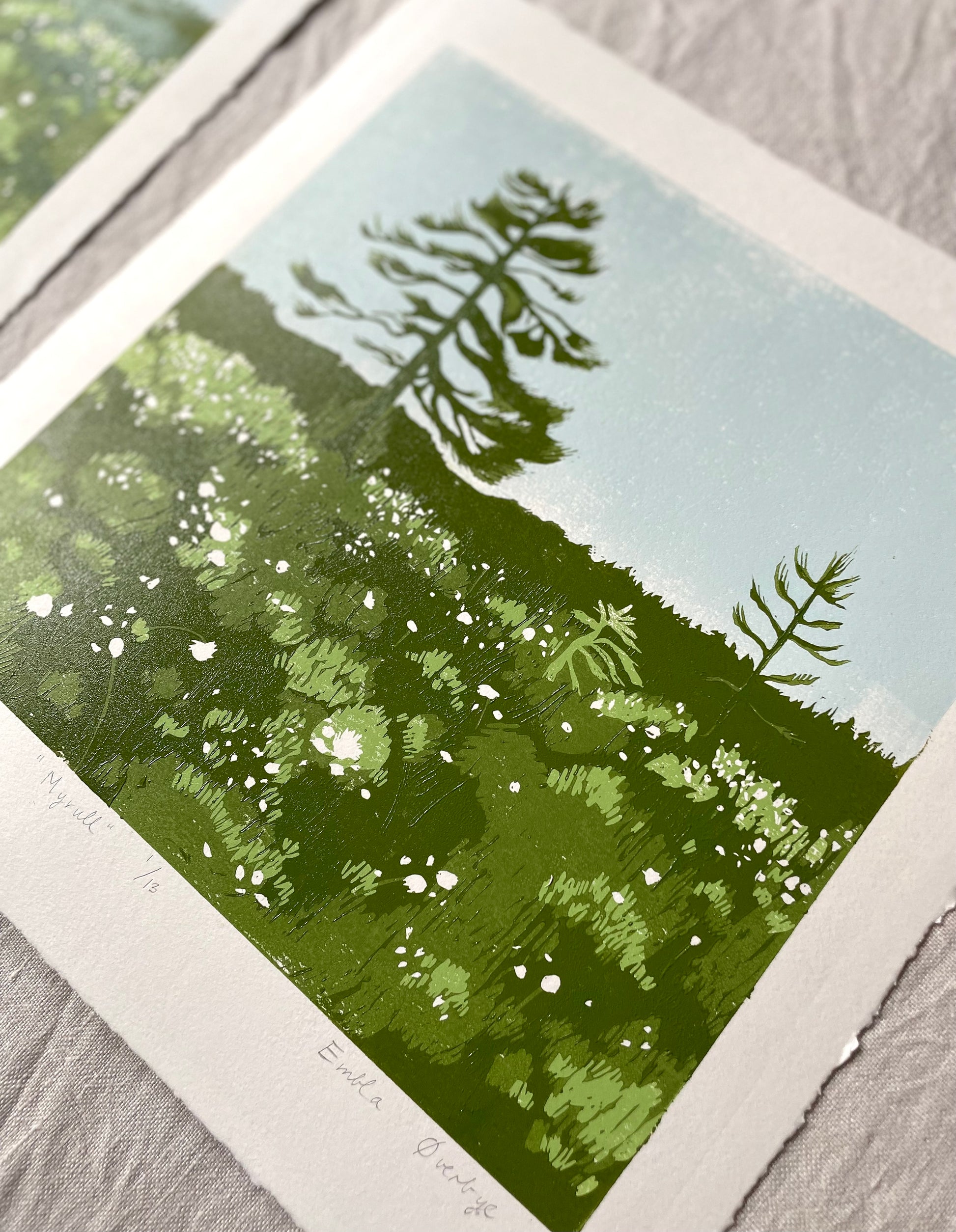 "Myrull" er et originalt linosnitt trykket med reduksjonsmetoden. Trykket med 4 lag, 5 farger. Som følge av prosessen blir platen destruert, det vil derfor aldri kunne trykkes opp flere av det.