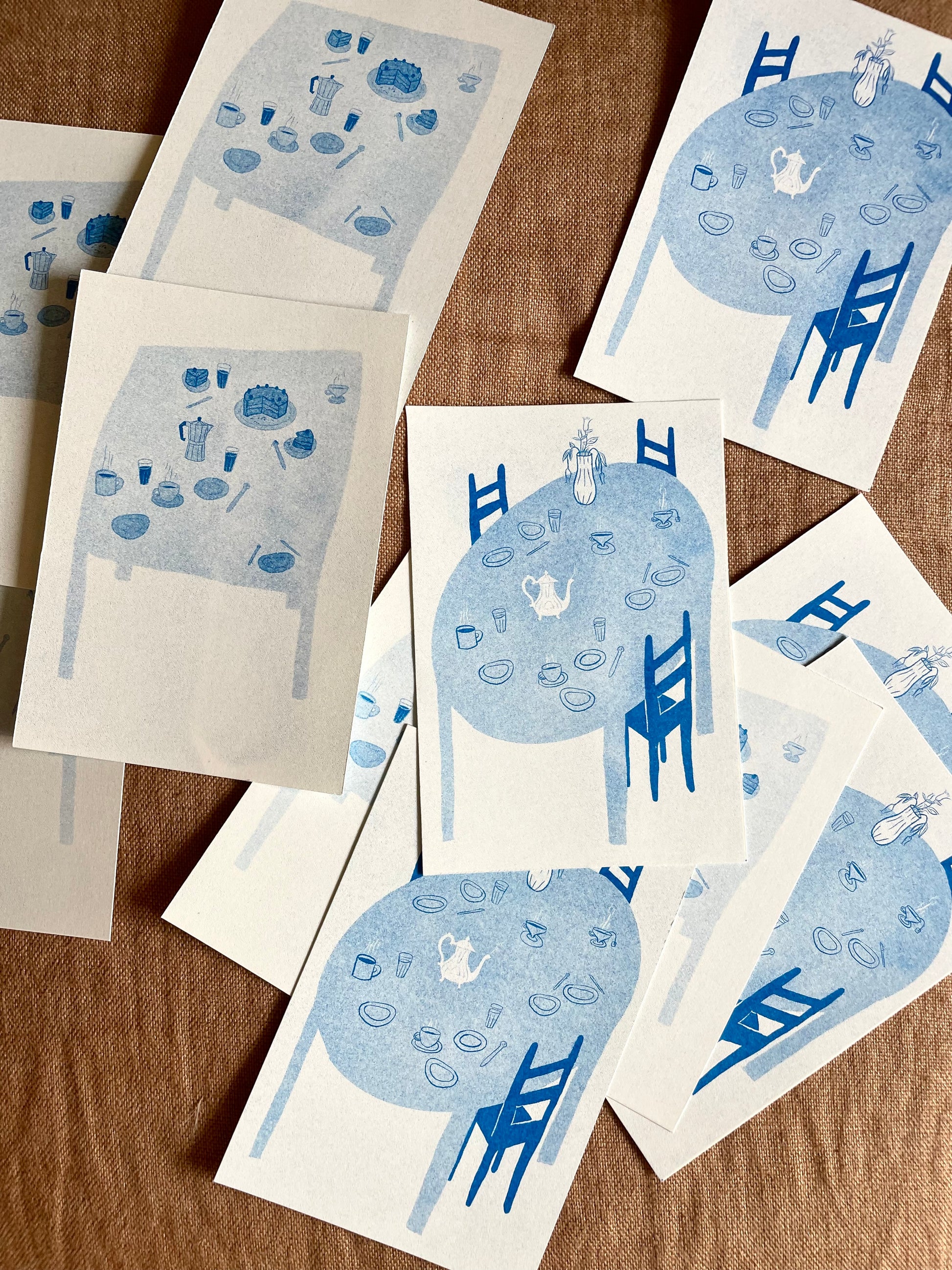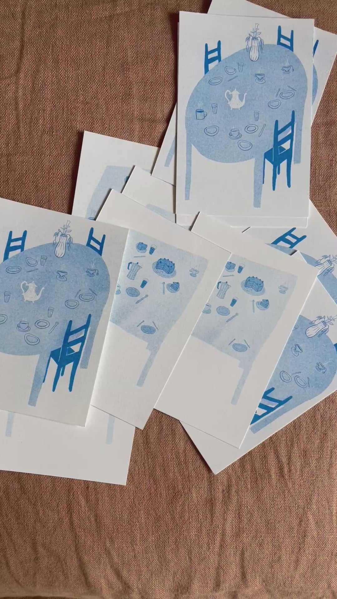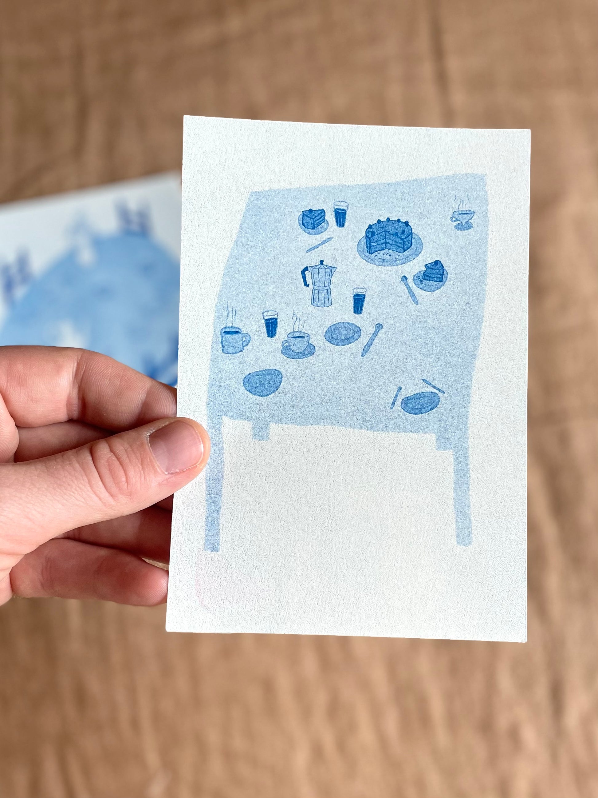 Kort i postkortstørrelse (ca A6), trykket med riso-teknikken.