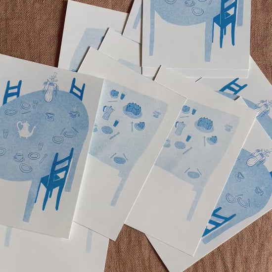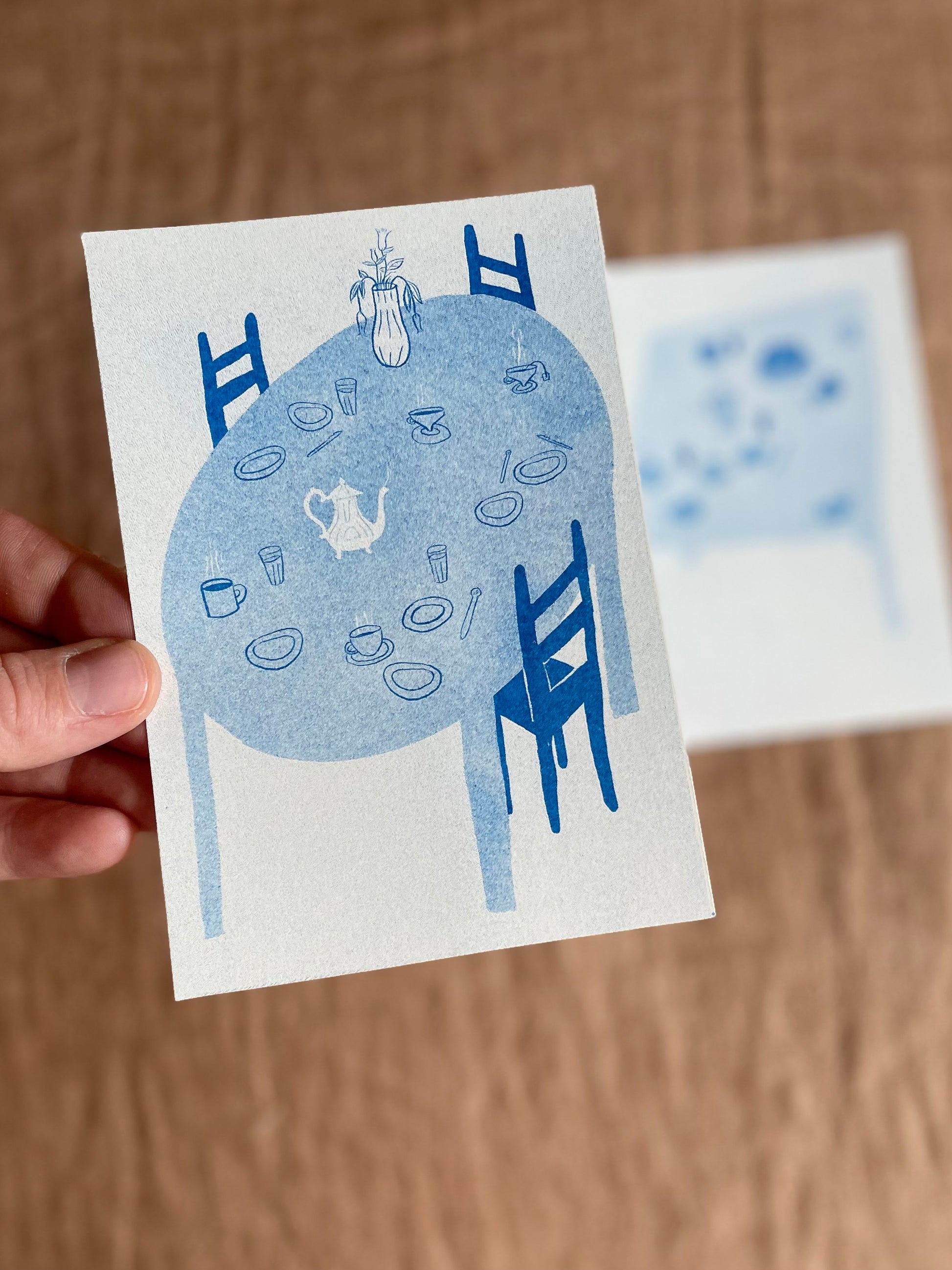 Postkortene er basert på risotrykkene «Selskap» og «Kaffe og kake» i A3 med samme motiv (kan også kjøpes i nettbutikken!)