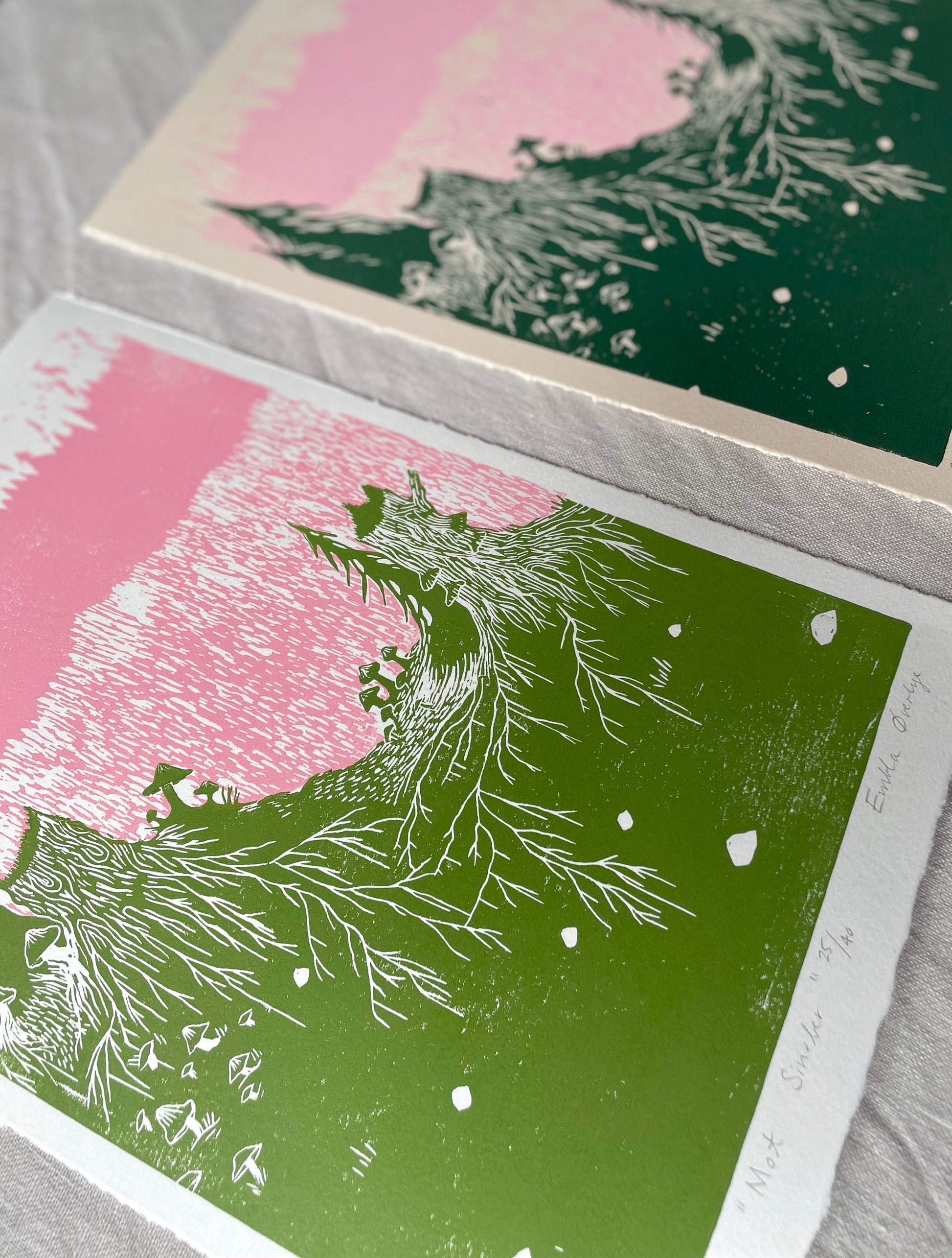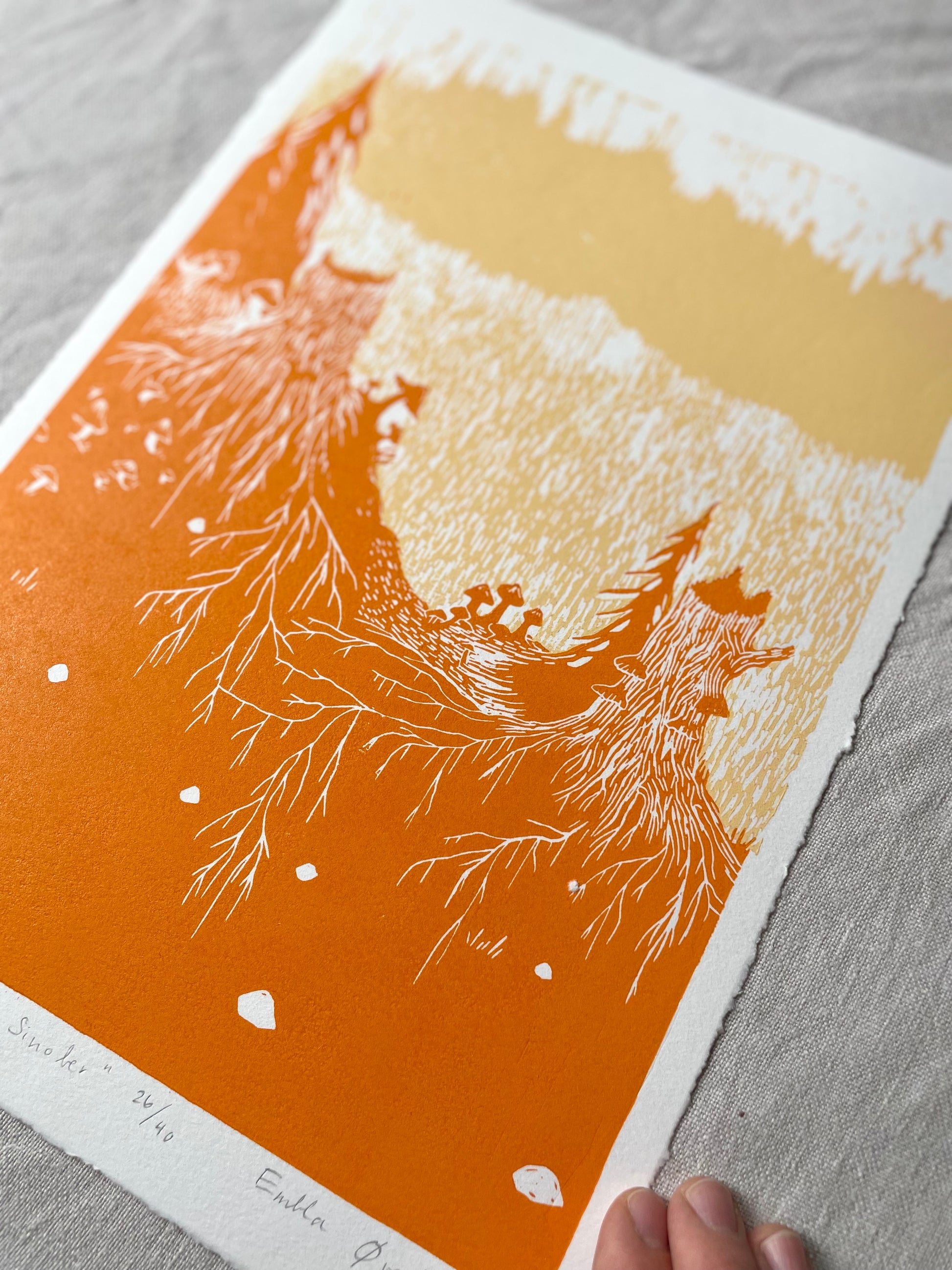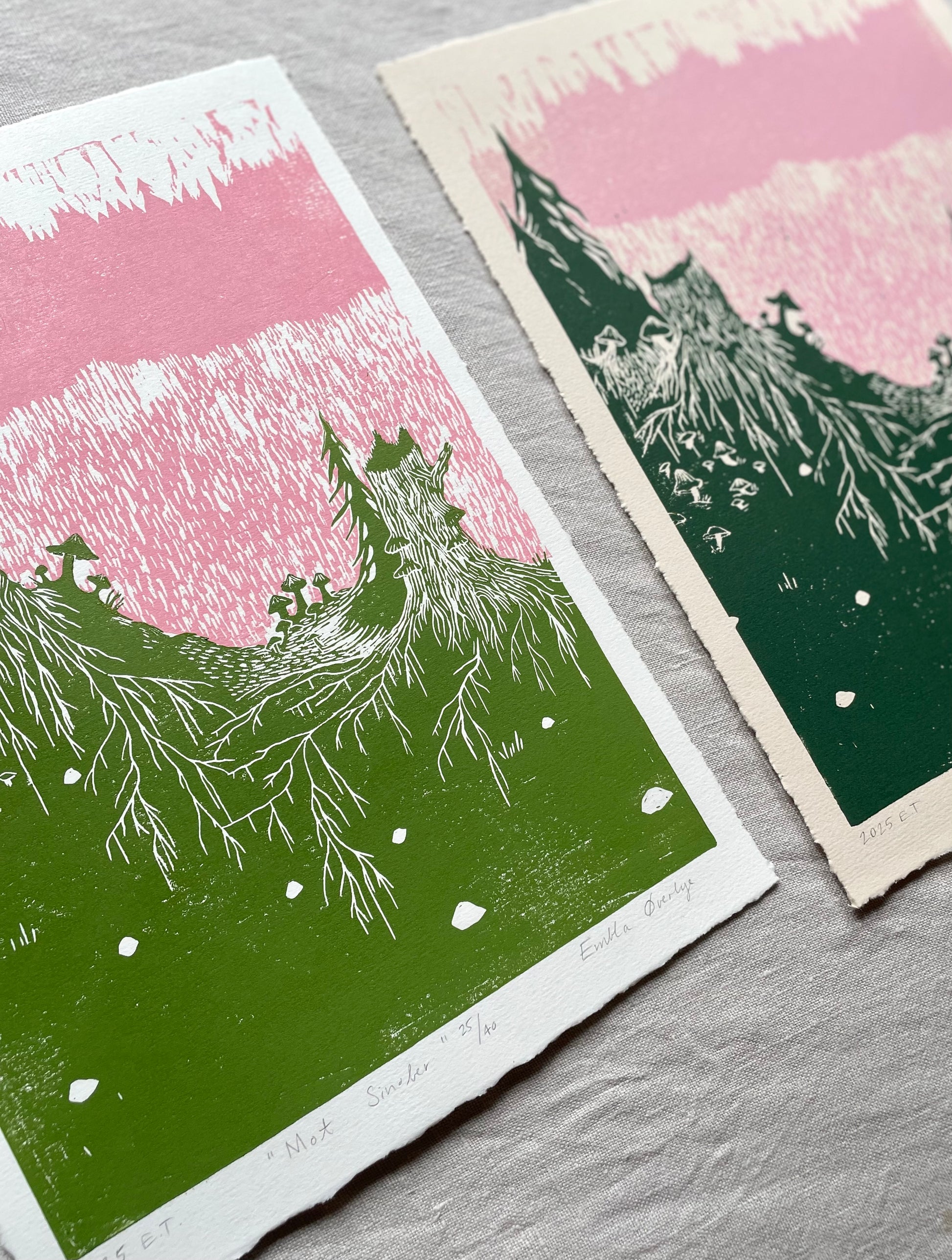 "Mot Sinober" er et originalt linosnitt trykket med to plater, to farger på varmtonet/hvit (se bilder) Fabriano Rosaspina 285gsm.