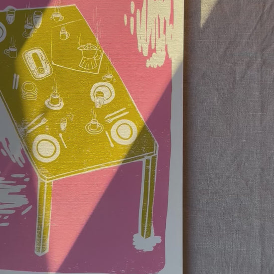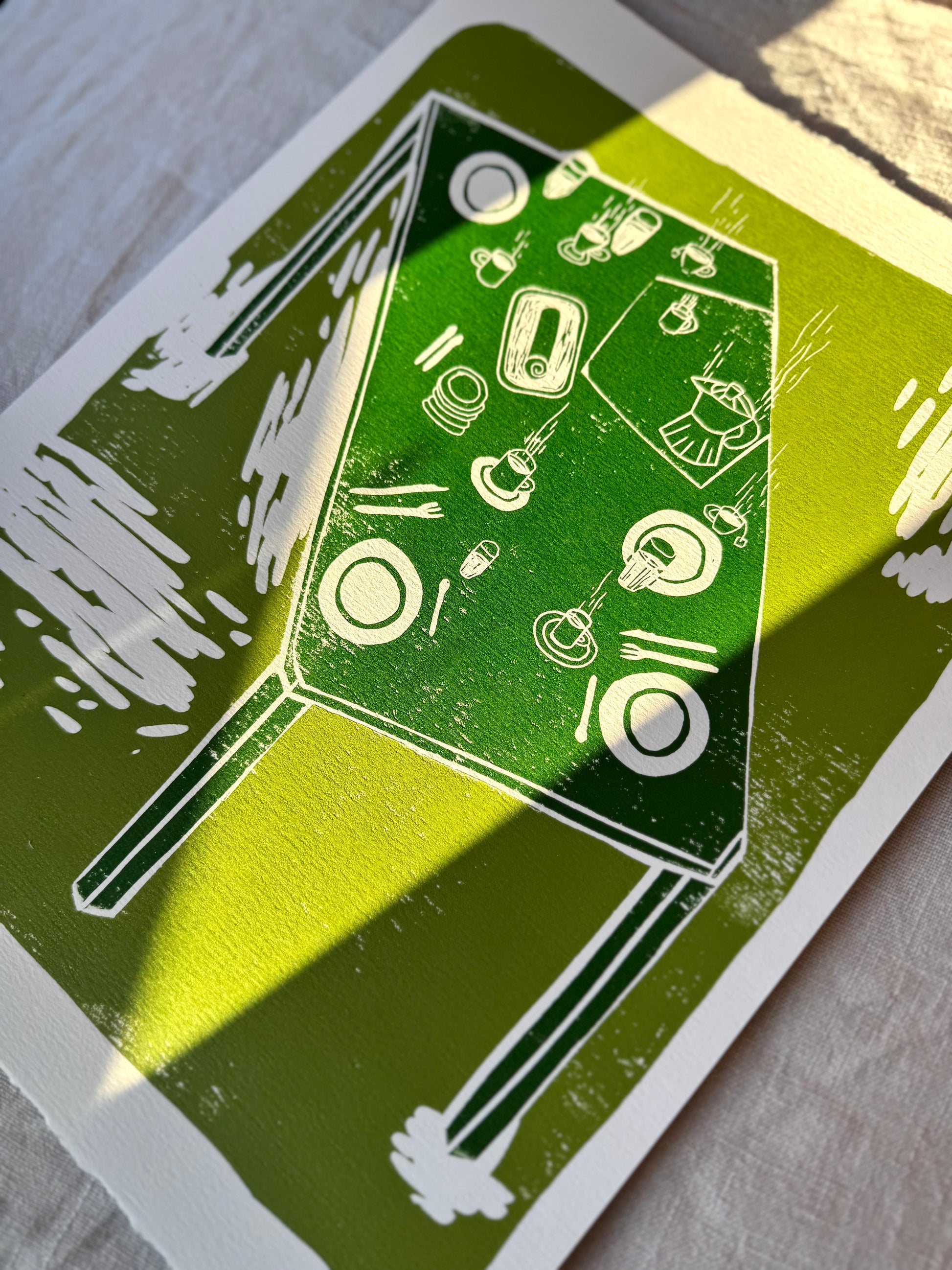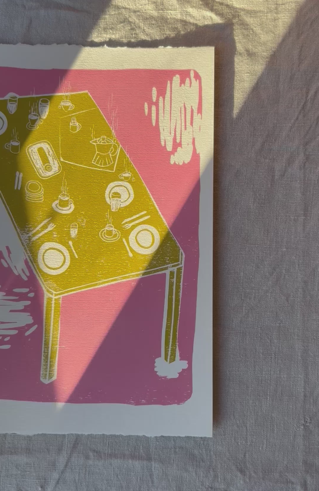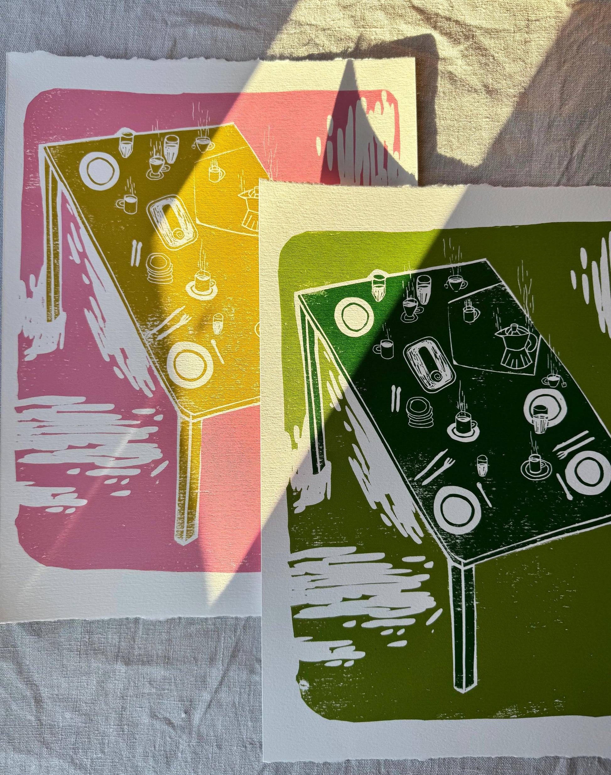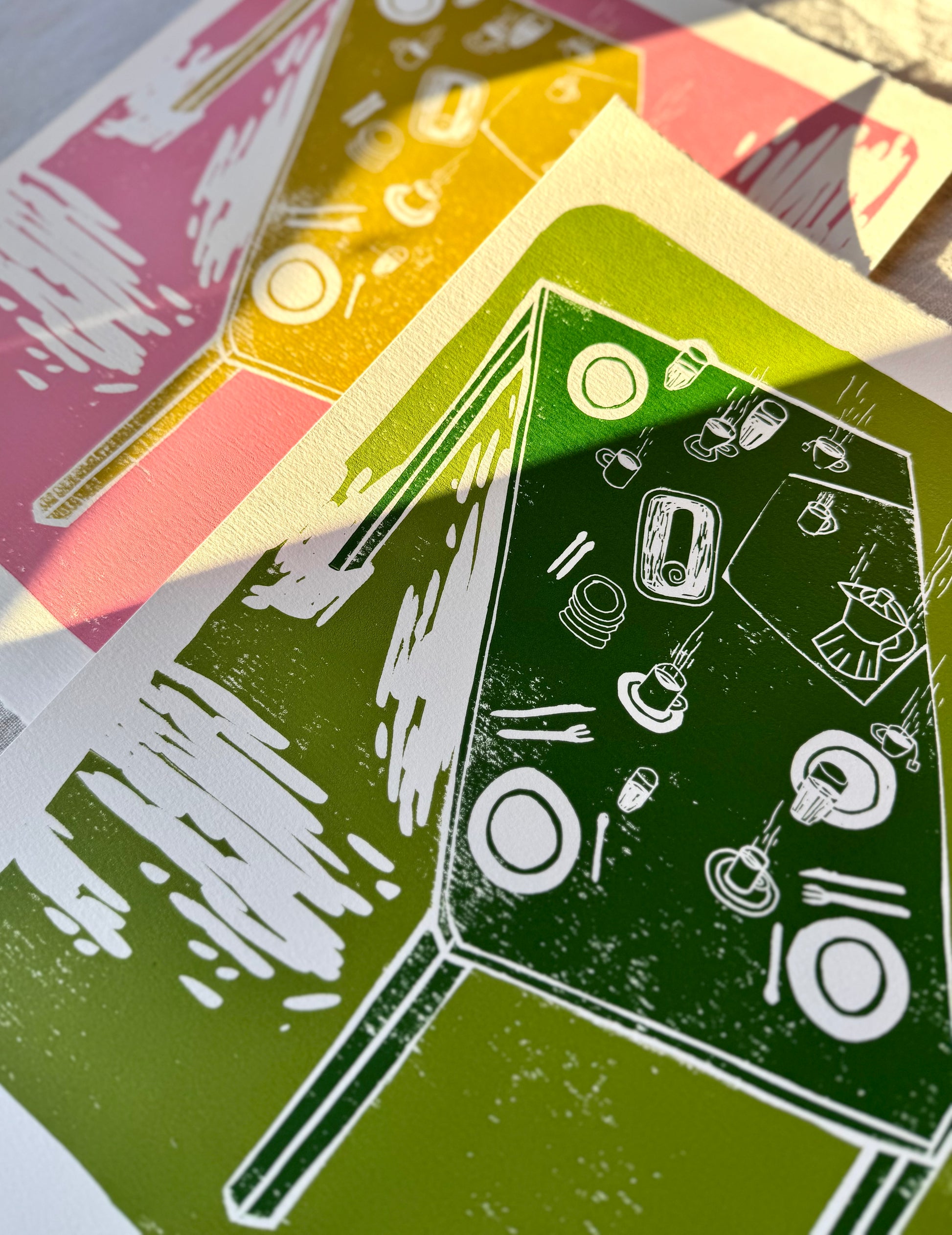 «Rullekake» er et originalt linosnitt trykket i ulike farger: