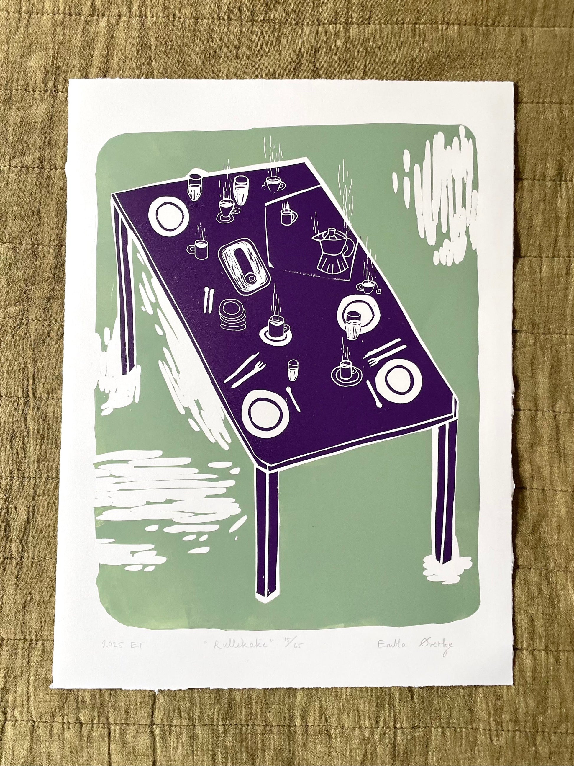 «Rullekake» er et originalt linosnitt trykket på Fabriano Rosaspina 285gsm varmtonet grafikkpapir (obs: utenom den lilla varianten, som er trykket på hvitt Hereford 145 gsm).