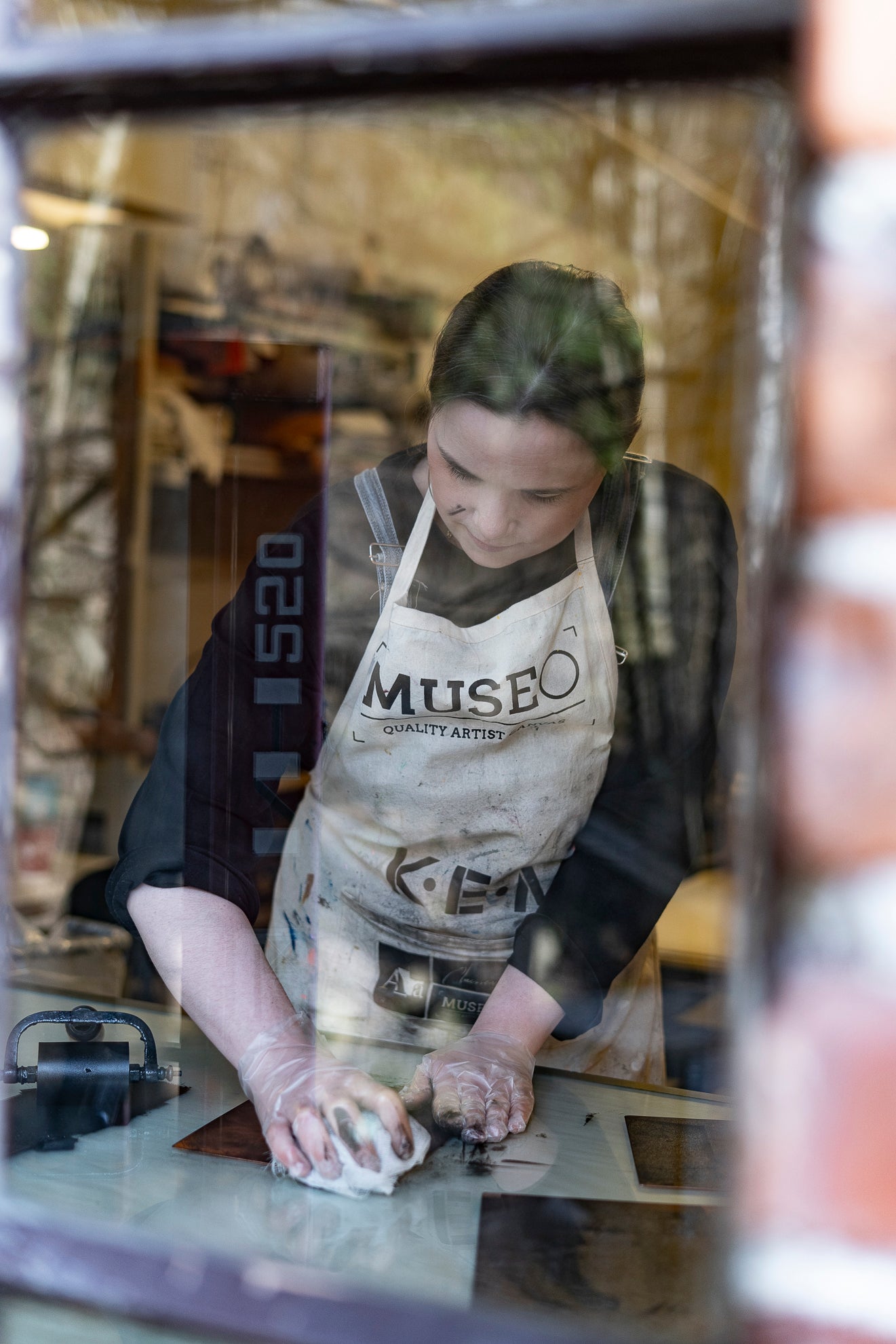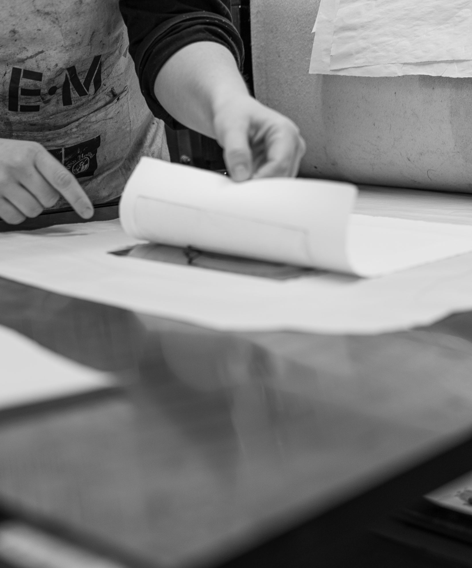 Trykket for hånd på atelieret på Kjelsås i Oslo.