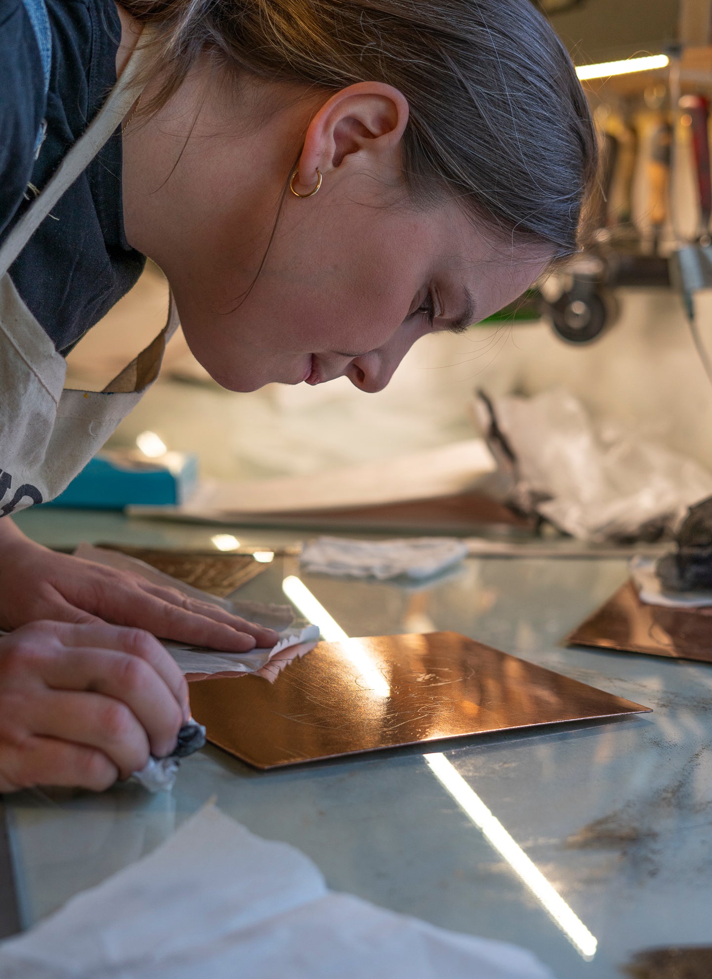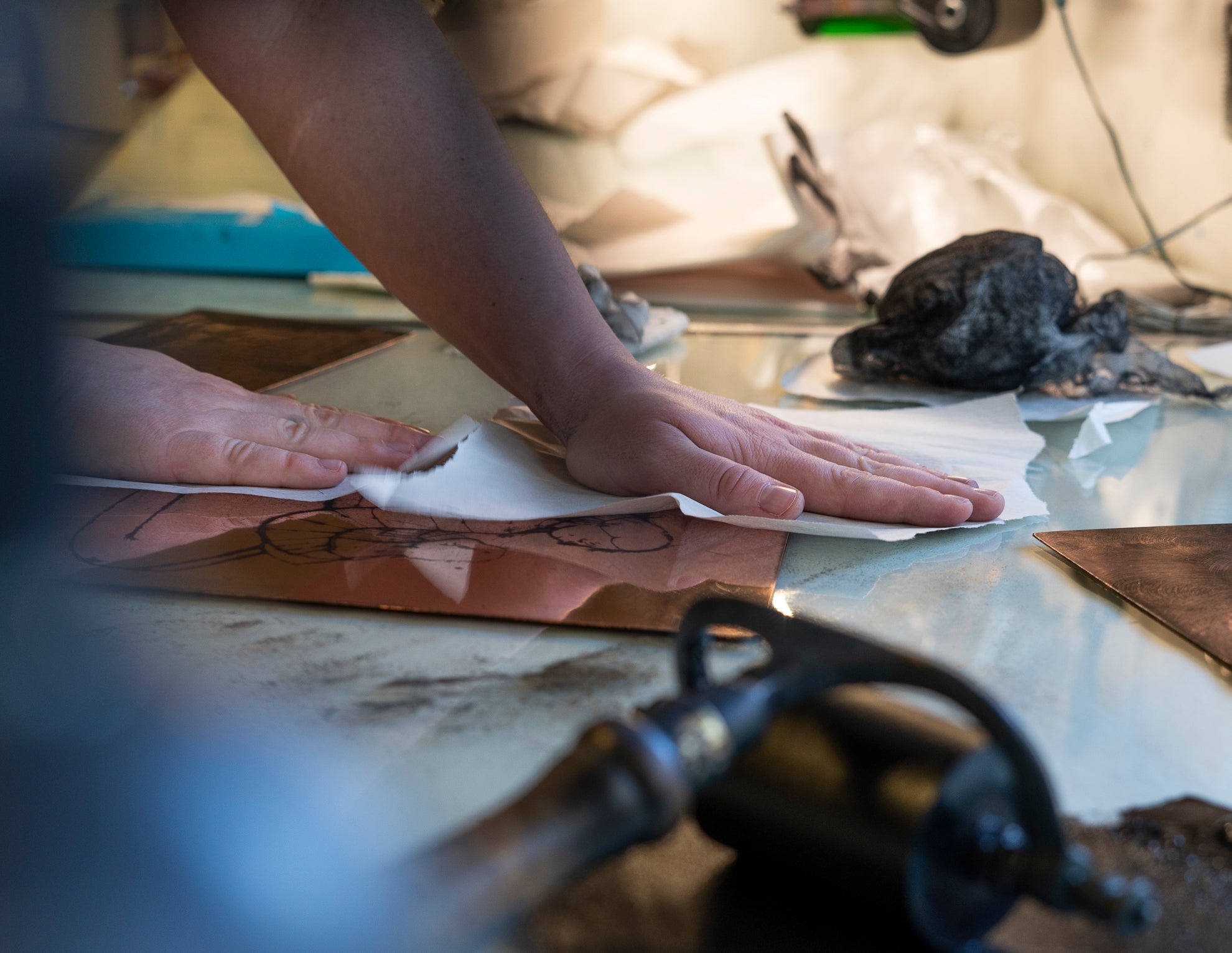 Trykket for hånd med dyptrykkspresse på Norske Grafikeres Verksted i Oslo.